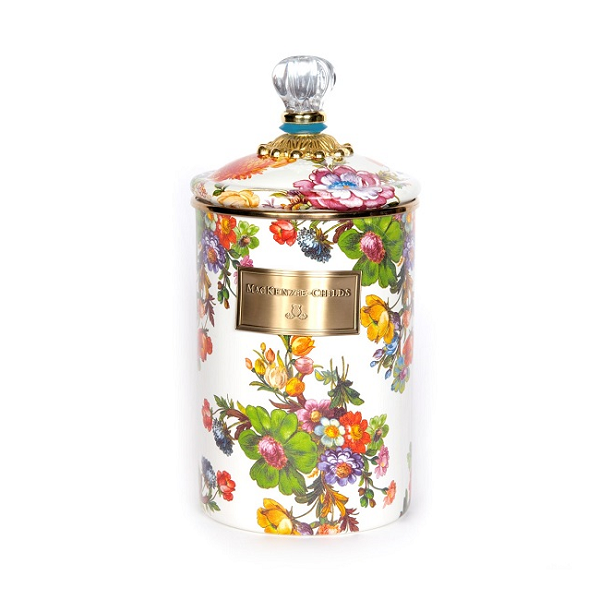 Банка для сыпучих продуктов большая изготовлена из толстолистовой стали, покрыта эмалью. Расписана вручную фирменным стилем в виде живописных букетов цветов. Крышка коронована стеклянной ручкой в виде распускающегося цветочного бутона.