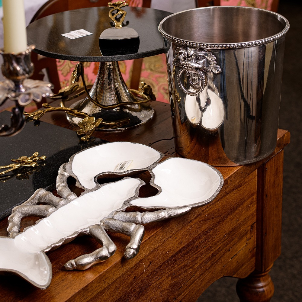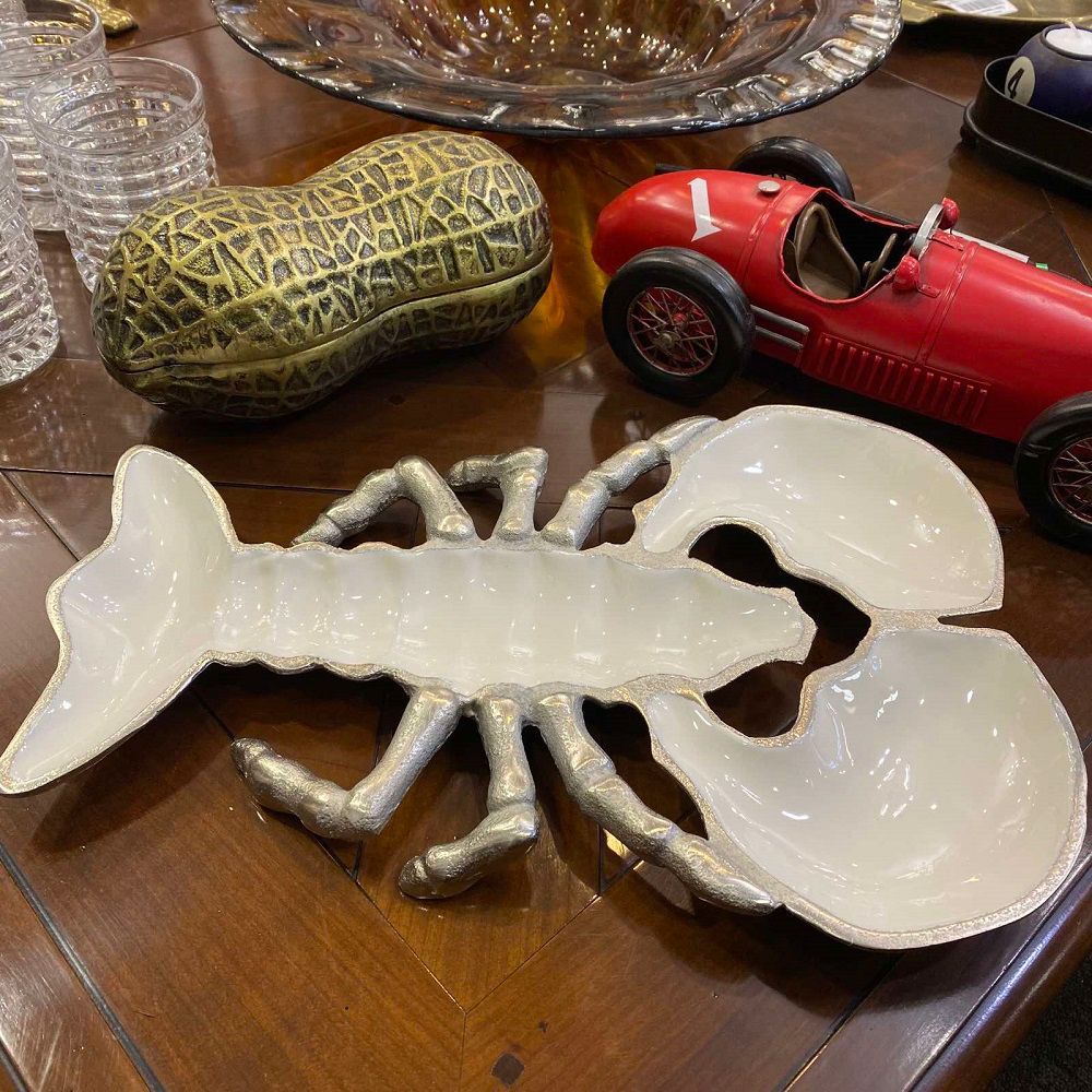 Идеальное блюдо для подачи закусок. Дизайн отсылает к Ар-деко, времени когда стали популярны изображения растений и животных из экзотических стран. Обратите внимание на эффектное сочетание нарочито грубоватых металлических и гладких покрытых эмалью частей.