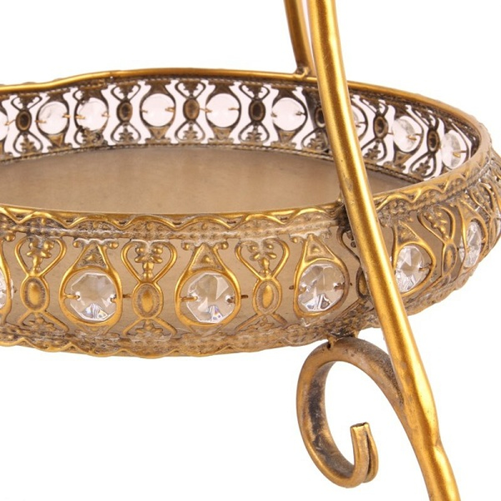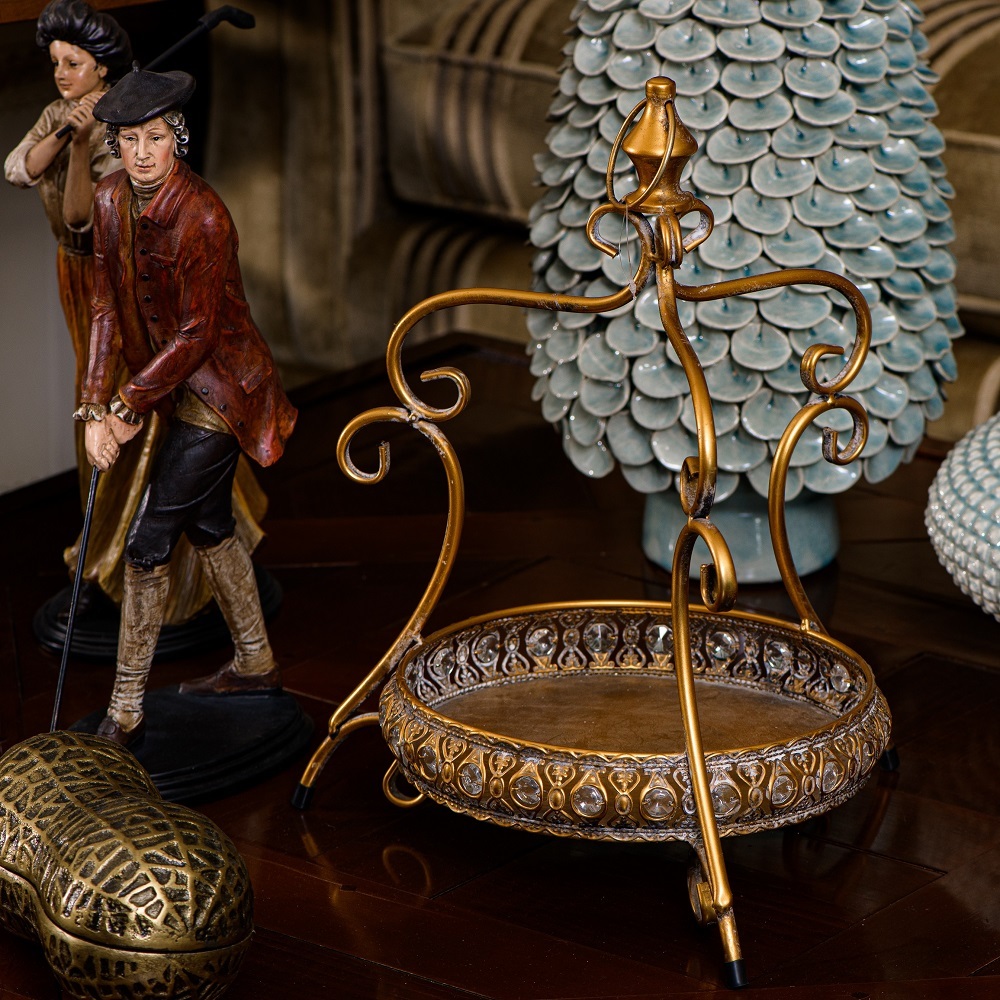 Еда приятнее, когда её легко подают красиво. Одинарная этажерка красивой формы изготовлена из железа с золотой отделкой и бусинками по краю. Это обязательный аксессуар для Вашего обеденного стола или для стильного приёма гостей.