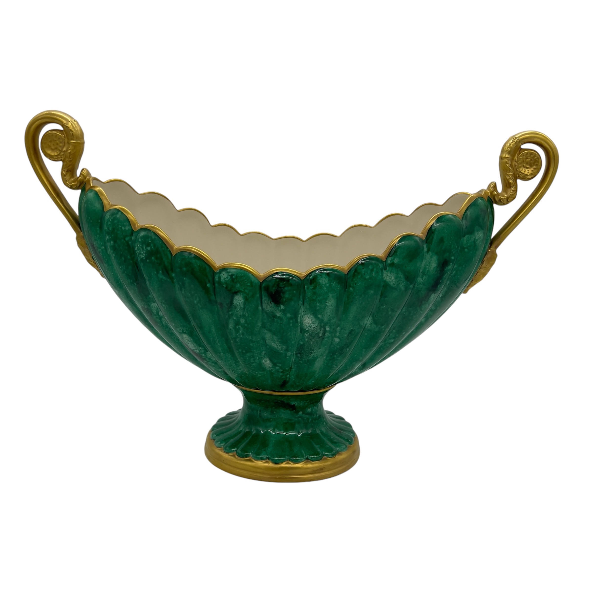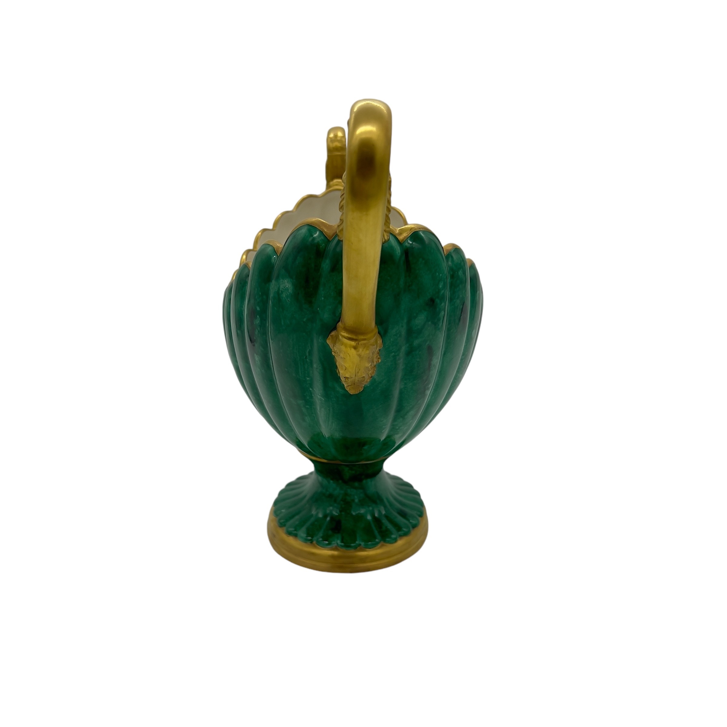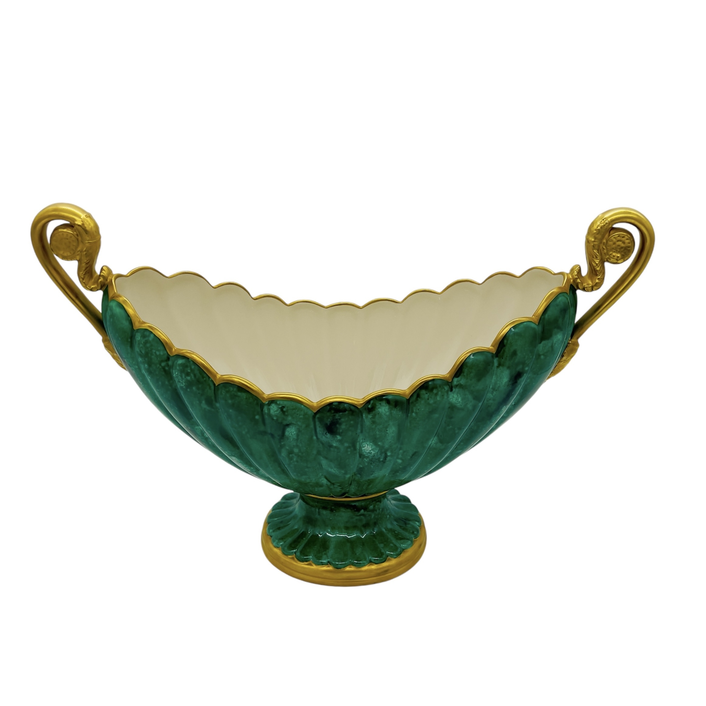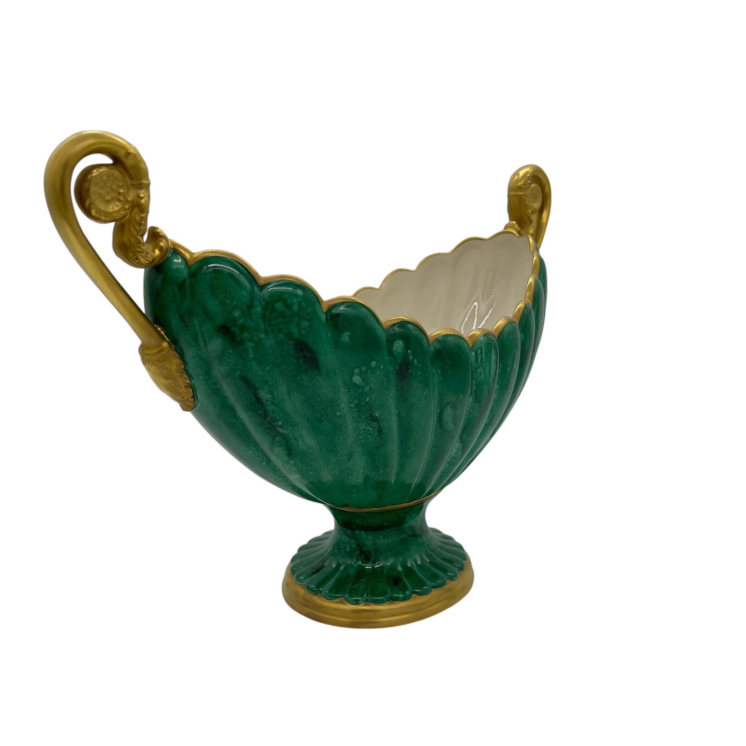 Ваза выполнена искусными итальянскими мастерами в классическом стиле из настоящего фарфора в виде большой раковины. С двух сторон вазу обрамляют изящные золотые ручки, по краю тонкой нитью протянут золотой кант. Декорирована 24-каратным золотом, что придаёт ей еще большую ценность. На каждом изделии стоит подпись автора Чезаре Виллари, что служит гарантией подлинности предмета.