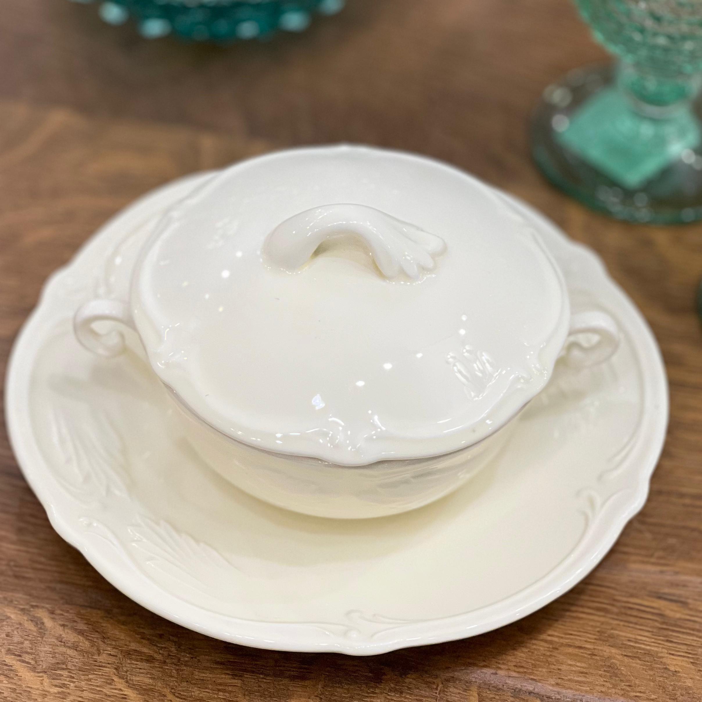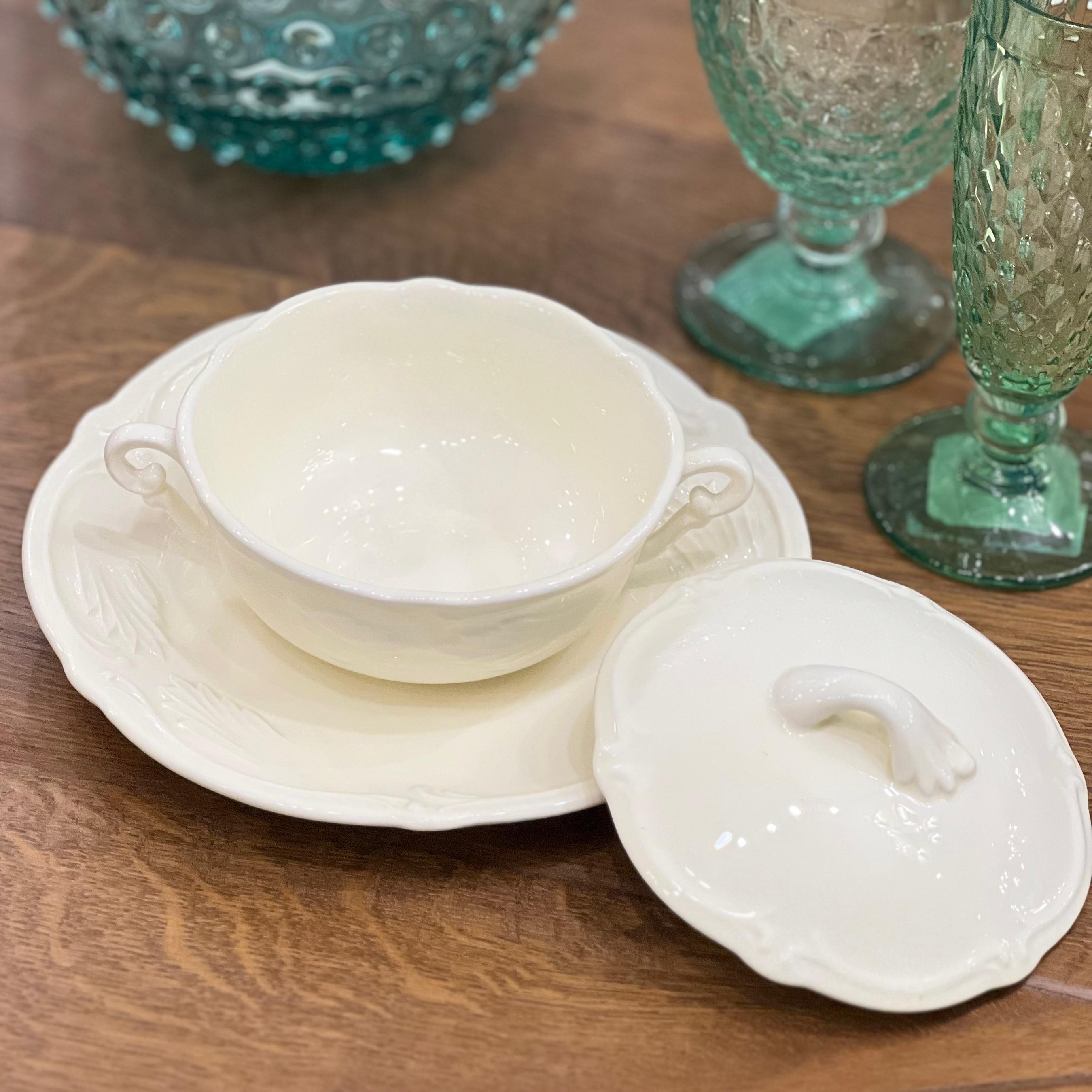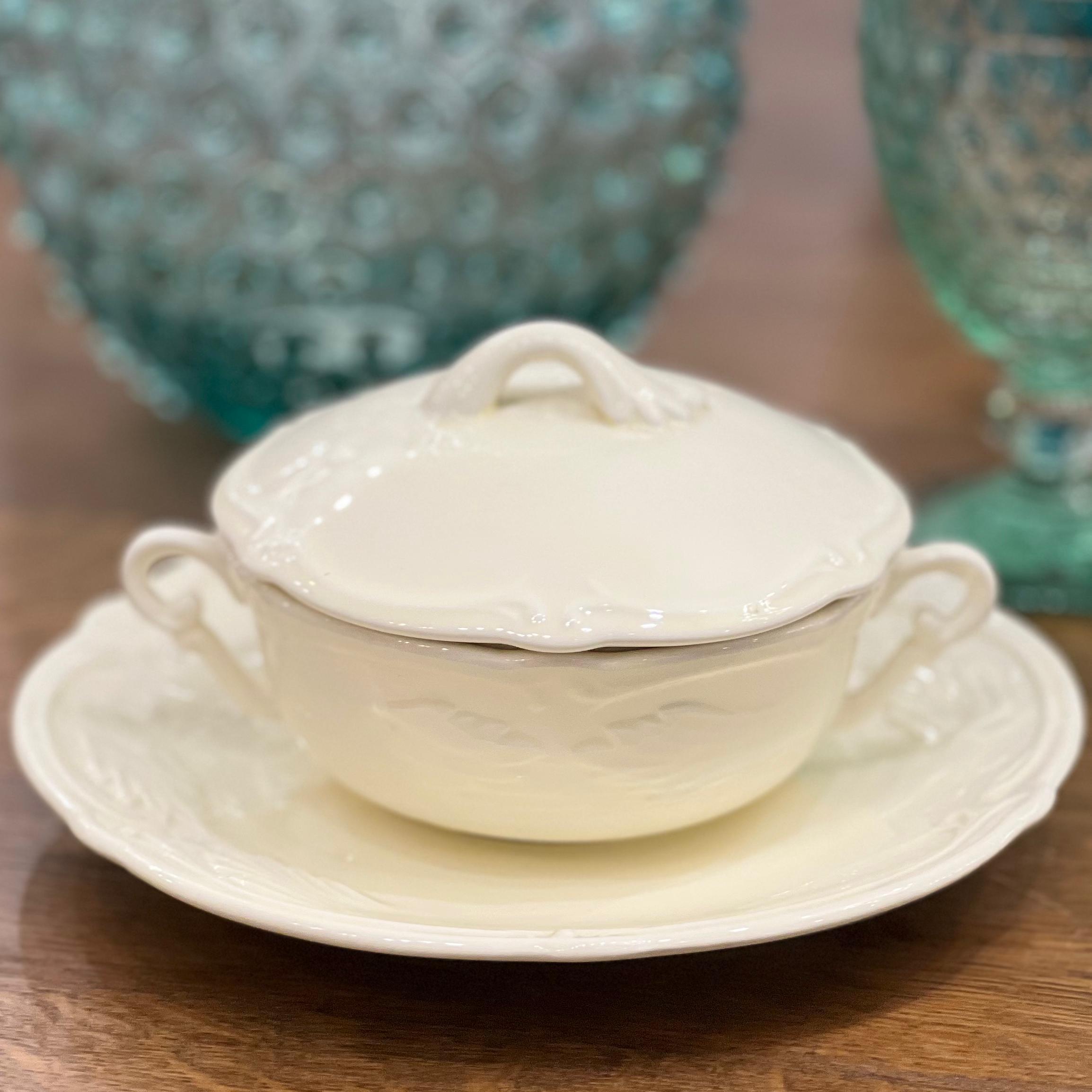 Чаша с крышкой и блюдце выполнены из высококачественного фаянса в классическом стиле, характерным для французского производителя Gien. Чаша имеет изящные ручки с обеих сторон и крышку с небольшим декоративным элементом сверху. Блюдце подчеркивает элегантность и функциональность набора, идеально подходя для сервировки горячих блюд, таких как бульон или суп.