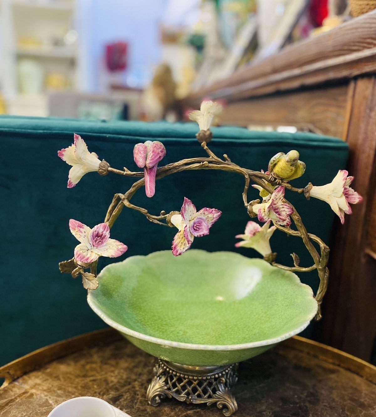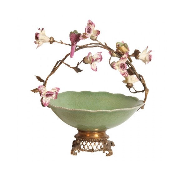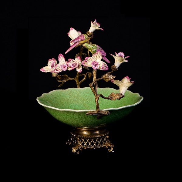 Декоративная фарфоровая ваза на бронзовой подставке. Её ручка украшена матовыми цветами и яркими попугайчиками.