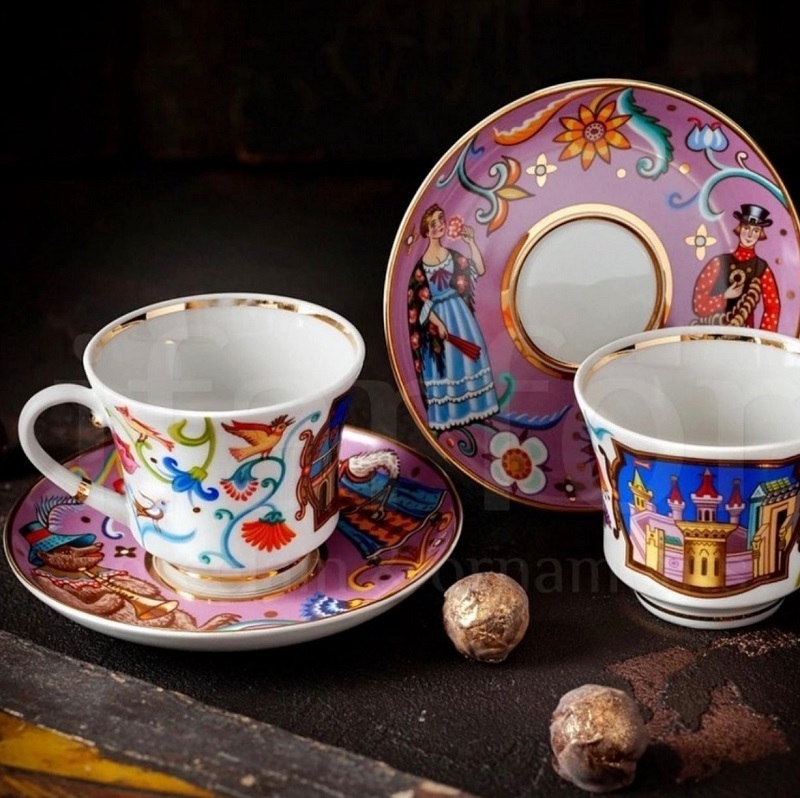 Вдохновением для создания красочной коллекции «Чудоград» стало русское искусство допетровского времени, в частности, Нарышкинское (Московское) барокко с характерным для него узорочьем. Стилевое решение декора отсылает к традиции русского лубка и книжных миниатюр. На предметах сервиза «выросли» нарядные дома в окружении диковинных птиц и эффектных золотых акцентов. Автор росписи – Ганзенко И. Г. Автор формы – Яковлева С.Е. Подглазурное декорирование кобальтом с элементами ручной росписи. Объём чашки 220 мл.