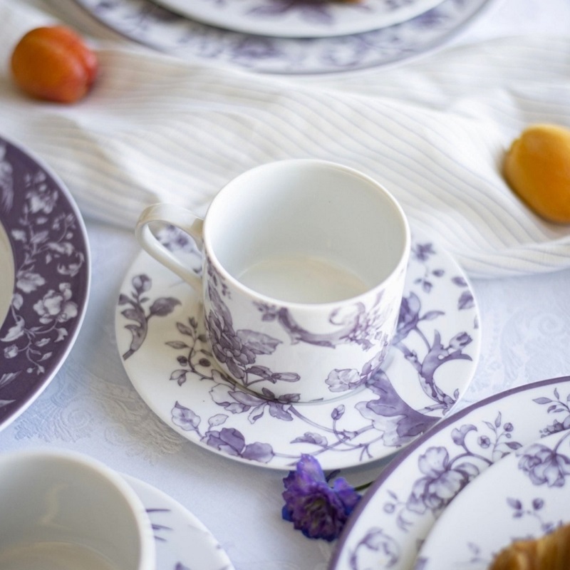 В коллекции «Монплезир» объединены современные тренды с французским шармом и восточной эстетикой. На фарфоре нет ничего лишнего, только утонченный рисунок, распустившийся на белоснежной глади материала. В изысканном декоре угадываются мотивы шинуазри: дивные цветы и птицы, исполненные в глубоком чернильно-фиолетовом цвете. Белоснежный твёрдый фарфор высокой прочности подойдет для ежедневной сервировки. Его можно мыть в посудомоечной машине неограниченное количество циклов и использовать в СВЧ-печах. Автор рисунка - Sabine Chenneviere и Ольга Будашова. Фарфор твердый; декорирование подглазурное монохромное. Объём чашки 300 мл.