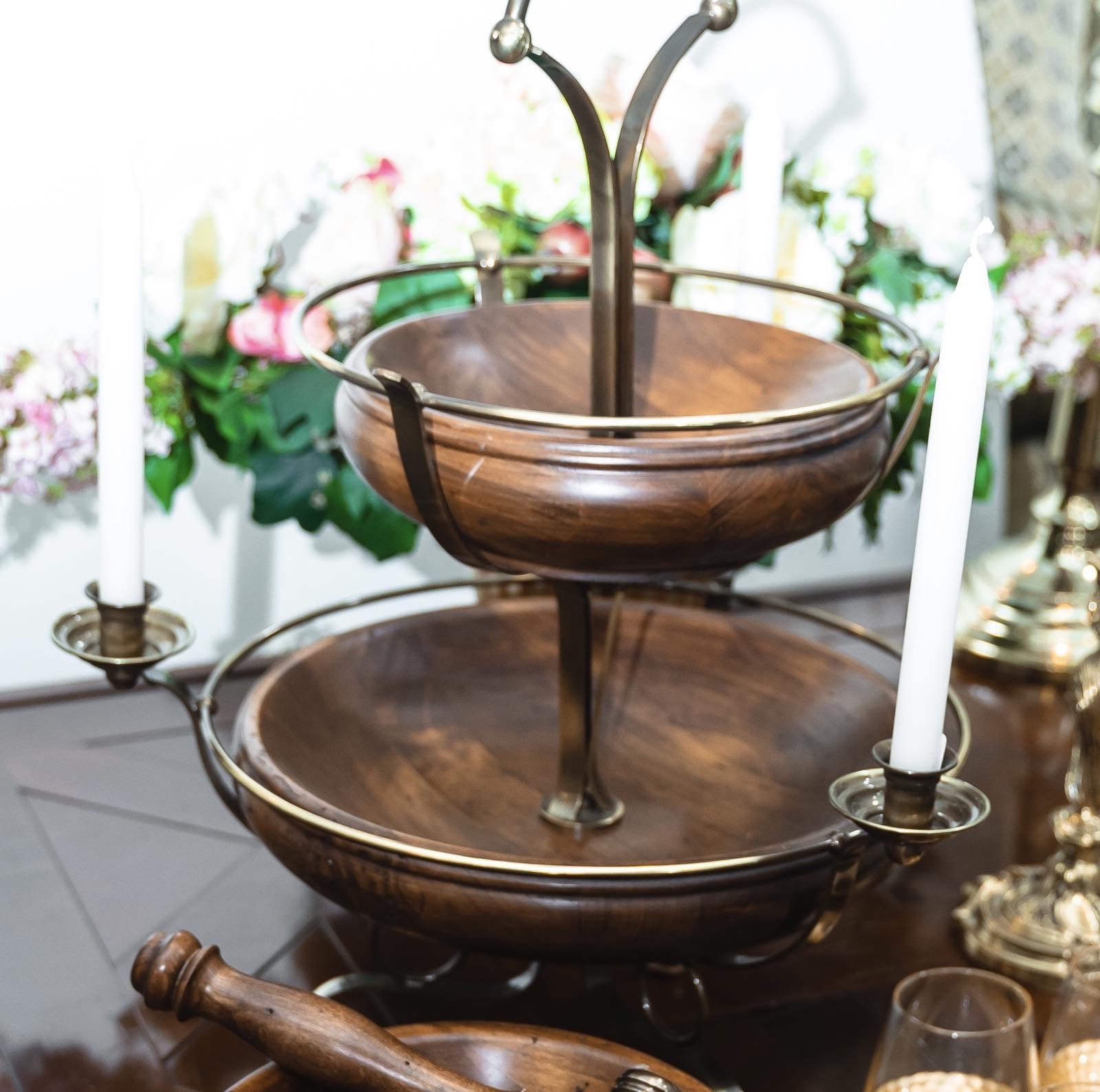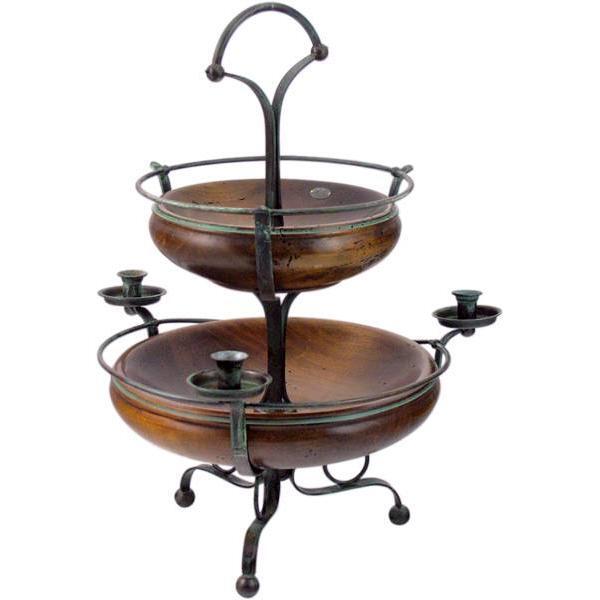 Чаша для фруктов состоит из двух ярусов и декорирована металлическими подсвечниками. Такое оформление делает её незаменимым многофункциональным гаджетом и оригинальным декоративным элементом.
