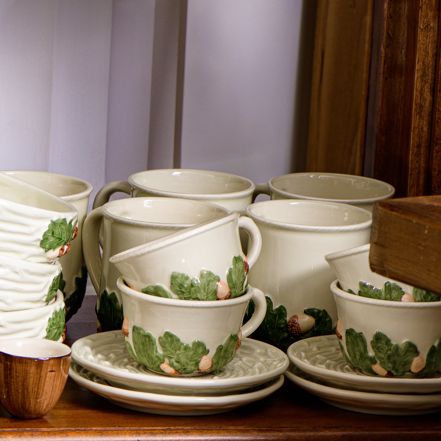 Коллекция Жёлуди увековечивает натуралистическое наследие бренда, представляя собой неожиданную и забавную коллекцию различных ёмкостей, которые могут служить не просто декоративными элементами, но и выполнять вполне утилитарные функции. Чаша с декором в виде желудей универсальна. Жёлуди не просто нарисованы, они выпирают на фоне зелени, создавая эффект натуральности. Выполнена в стиле майолика – очень старинной технике производства керамики. Она представляет собой процесс, при котором глиняная основа, созданная мастером, покрывается глазурью с высоким содержанием свинца, а после подвергается обжигу. Такая посуда ценится своей стойкостью к температурам и её можно мыть в посудомоечной машине, с годами её блеск и яркость не утрачивают актуальность.