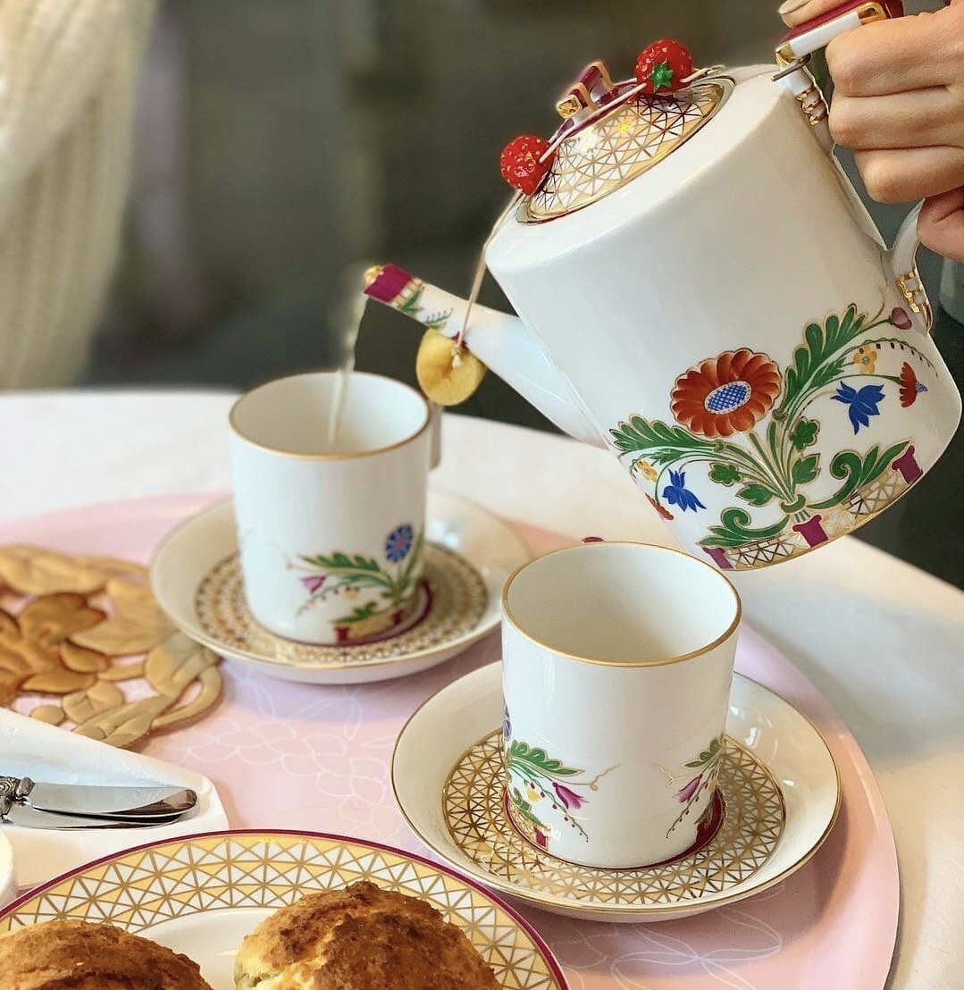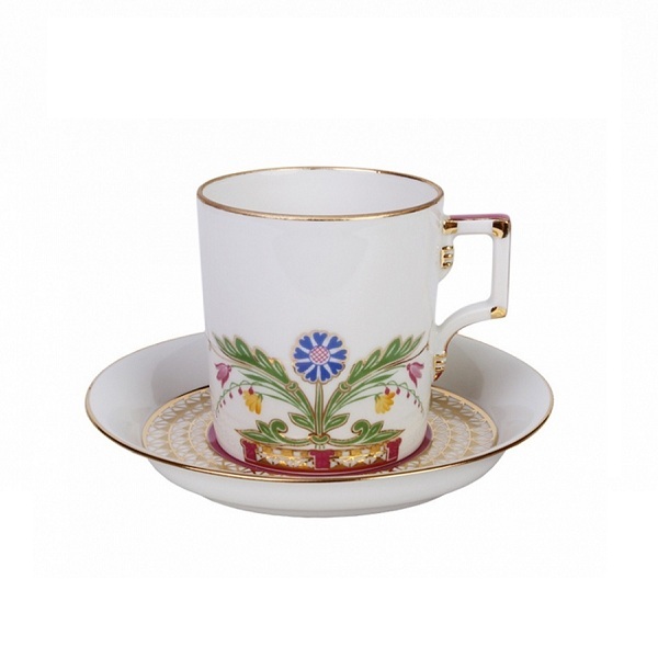 Чашка с блюдцем изготовлена из твёрдого фарфора. Для декорирования используется надглазурная деколь, ручная роспись. Серия "Замоскворечье" производится с 2004 года. Для создания оригинального декора художник использовала полихромную цветочную живопись в традициях древнерусских цветочных орнаментов, которые встречаются в оформлении стен Грановитой палаты Московского Кремля.