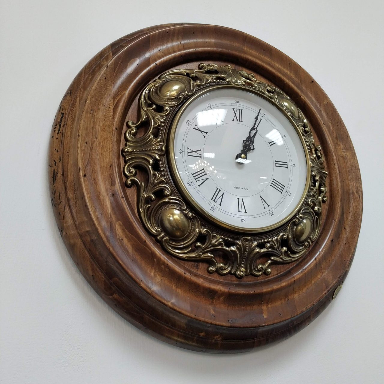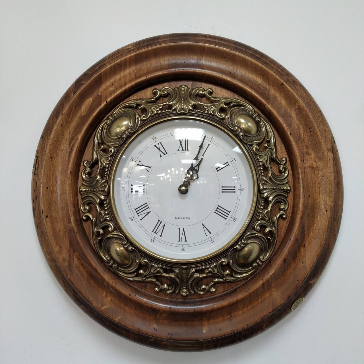 Роскошные настенные часы в старинном стиле. Большая круглая оправа изготовлена из натурального дерева. Циферблат закреплен в оправе из солидного латунного кружева с витиеватым узором. Ажурные стрелки движутся по керамическому циферблату с четкими римскими цифрами.