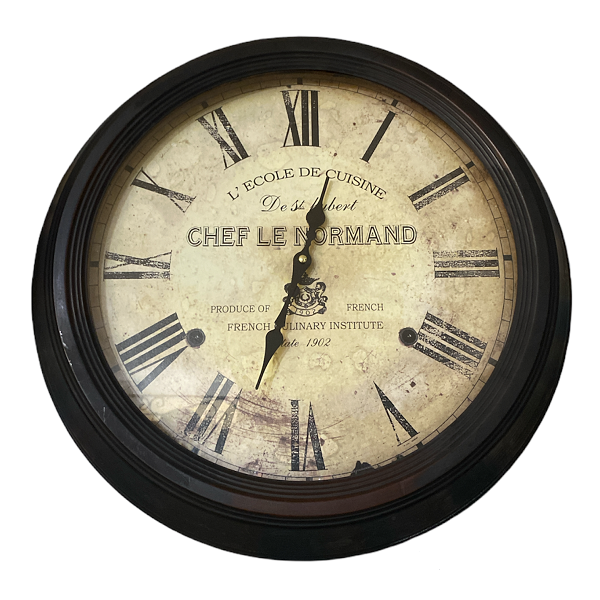 Для дружеской атмосферы выберите эти часы Кулинарная школа - Шеф-повар Нормандии. Эти часы прекрасно впишутся в Гранж, Лофт и Индустриальный стиль. Благодаря патинированной железной раме, римскому циферблату и выдержанному жёлтому фону идеально подходят для украшения кафе, бара, паба.