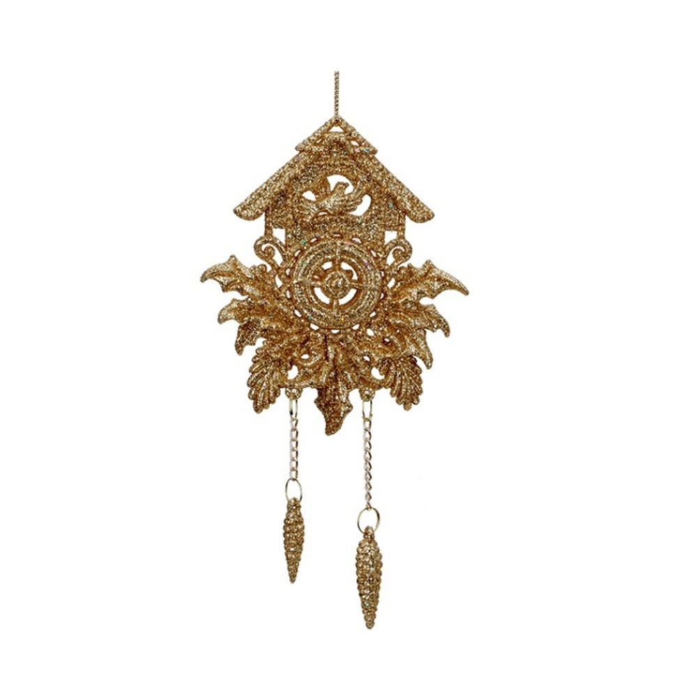 Изысканный новогодний декор представлен подвеской в виде часов, напоминающих домик для птички. Они украшены блёстками и будут изящно сверкать в свете новогодних гирлянд. Изюминкой декора являются две шишки, подвешенные к золотым часам на цепях.