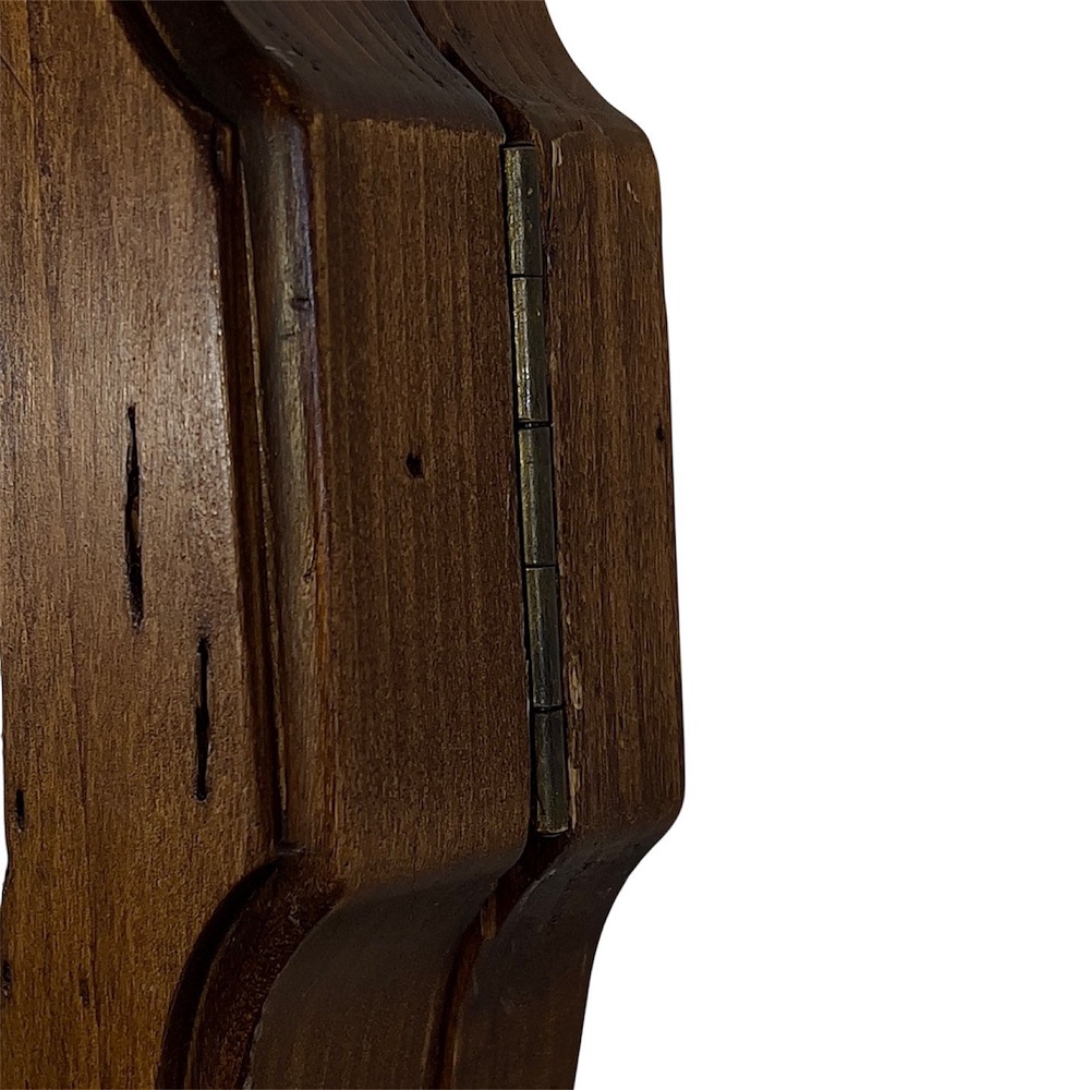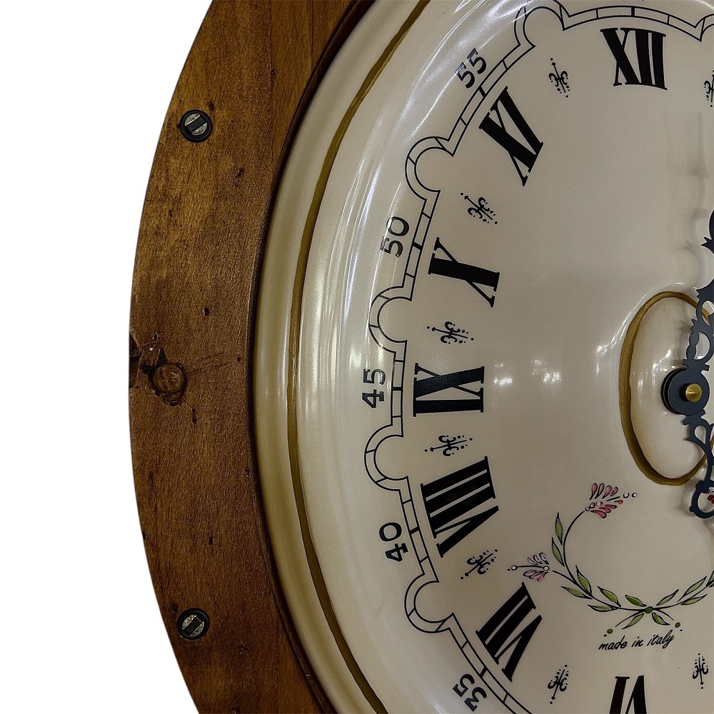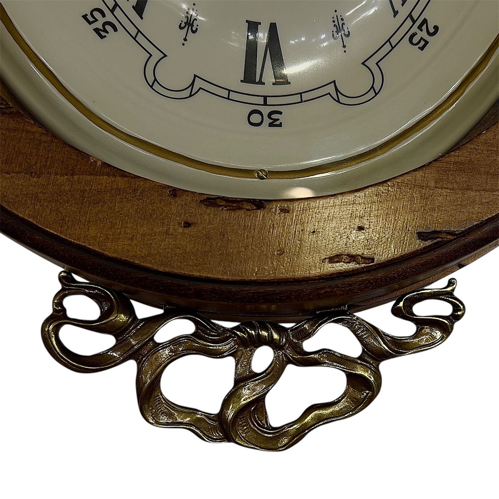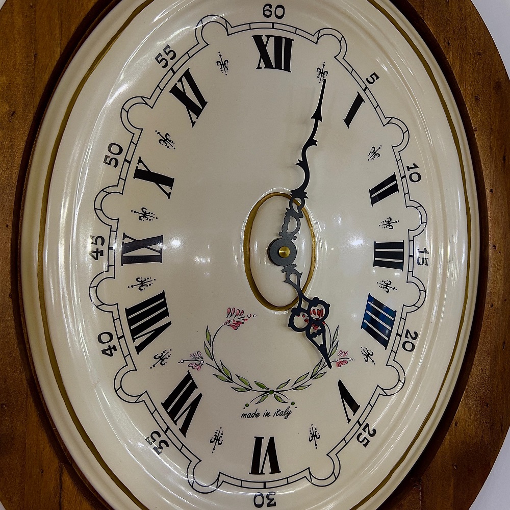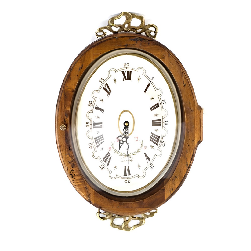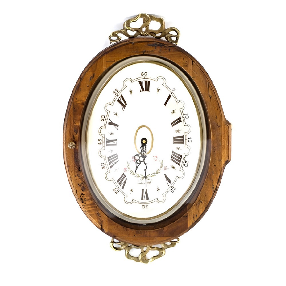 Старинный дух окутывает необычные овальные часы в деревянной рамке. На передней панели со стеклом – ручка для открывания. Верх и низ украшен металлическим декором. На белом циферблате для часовой стрелки предусмотрены римские цифры, а для минутной – арабские.
