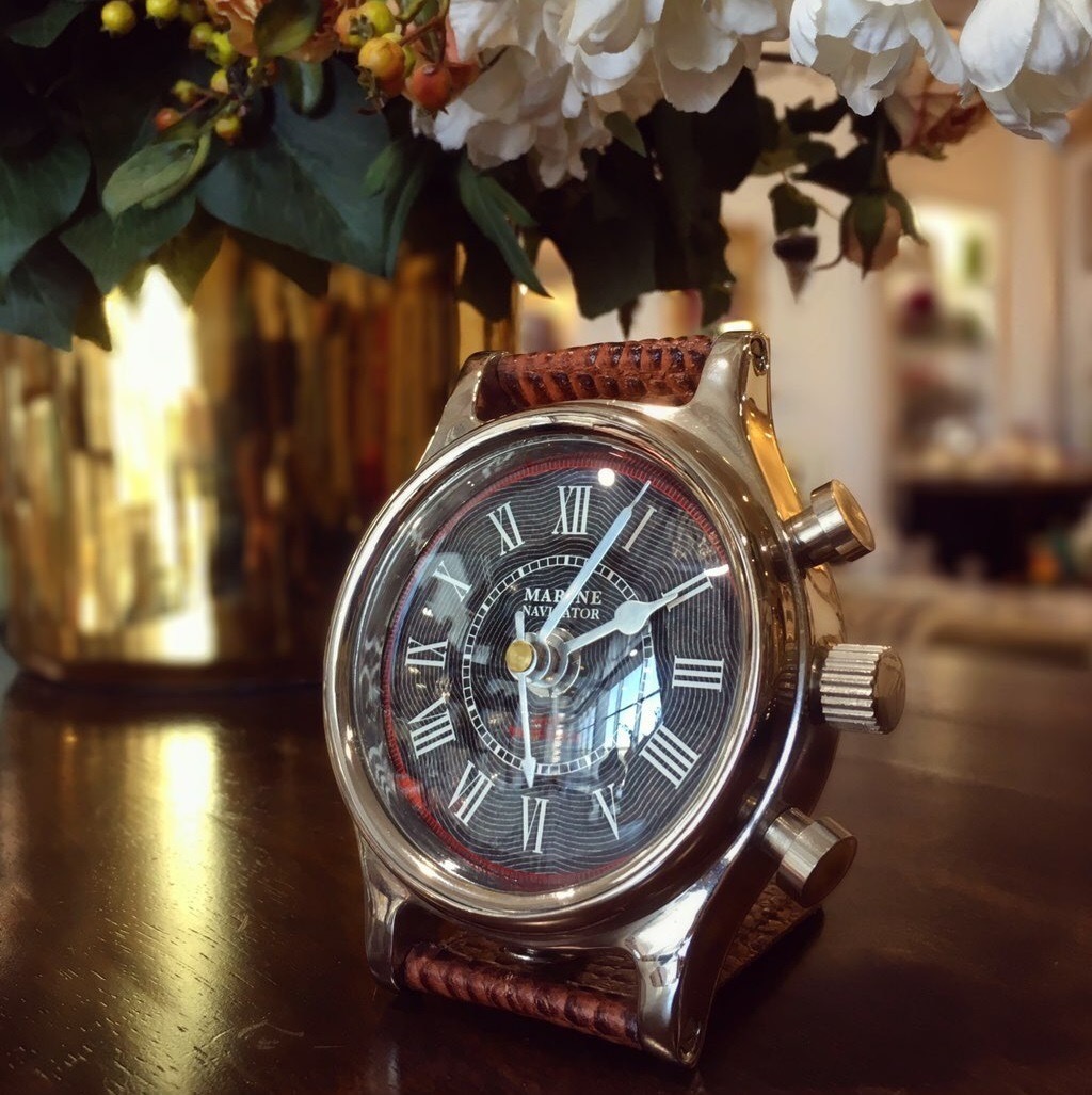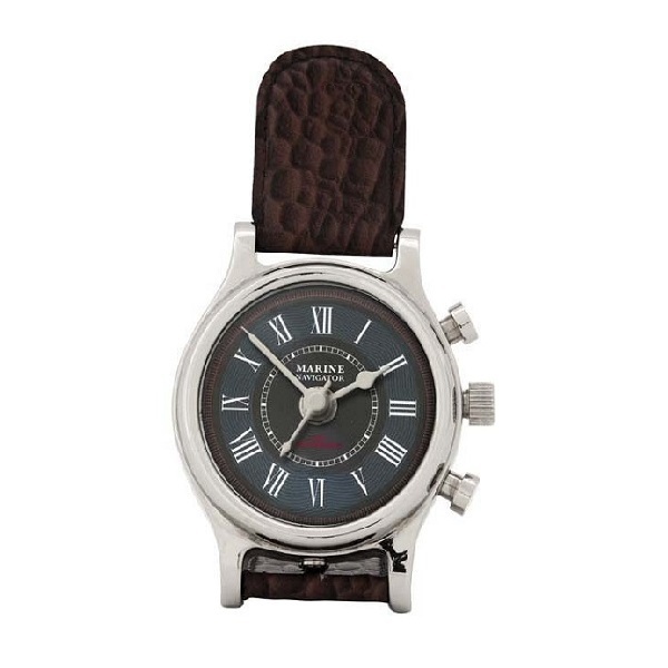Эти настольные часы имеют форму классических наручных часов и имеют круглый корпус с никелевым покрытием и подставку из коричневой кожи.
