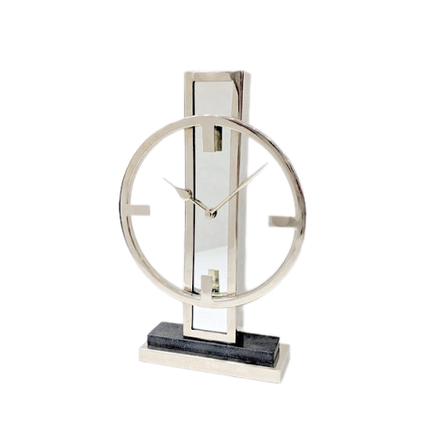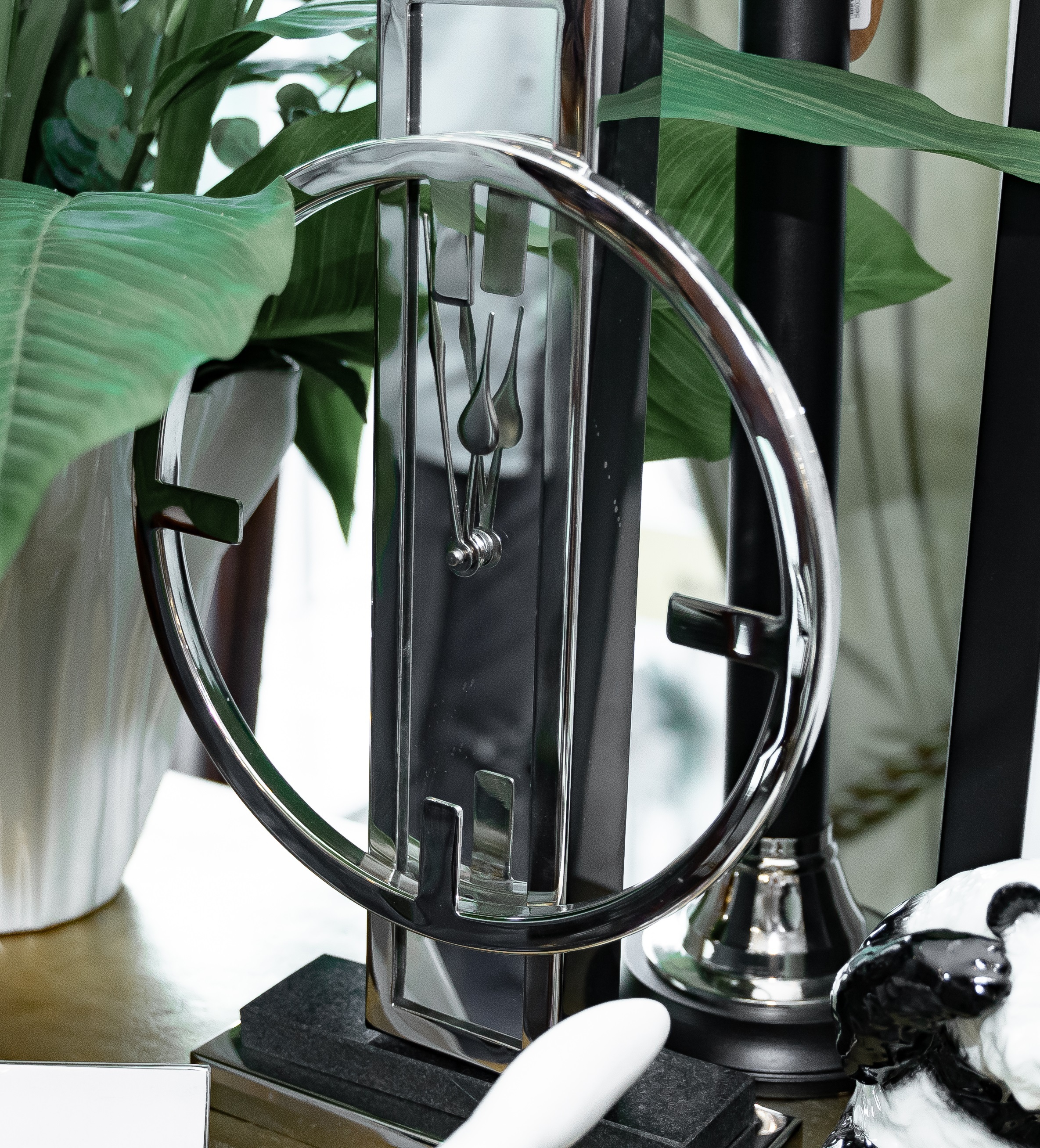 Зеркало на заднем плане добавляет часам объём, превращая их в своего рода кинетическую инсталляцию и усиливает тем самым эффект движения. Цифры на нём отсутствуют, что придает часам необычный вид.