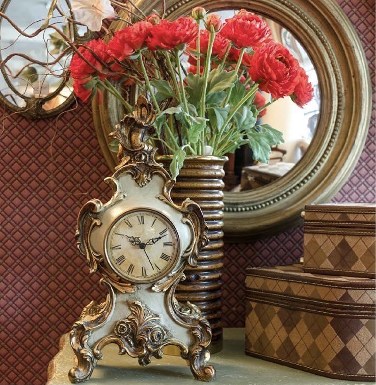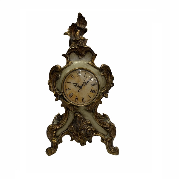 Эти изысканно украшенные настольные часы в старинном стиле изготовлены из полирезина и отделаны старинным золотом. Придайте неподвластную времени элегантность вашему комоду, камину или тумбе с этими настольными часами на изысканной изогнутой ножке. Часы с традиционным римским циферблатом и широкой секундной стрелкой украшены множеством завитков и деталей, красиво отделанных старинным золотом, что придаёт им винтажный вид.