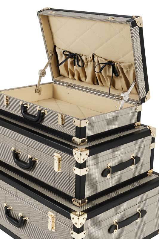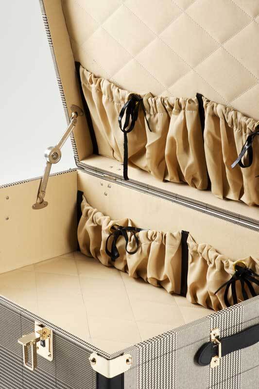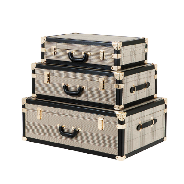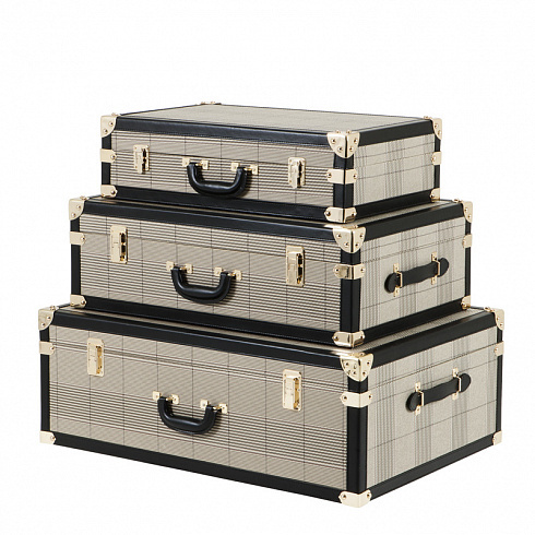 Чемодан обтянут тканью коричневого цвета, имеет кожаные вставки чёрного цвета. Замки и стяжки из металла цвета античная латунь. Внутри обтянут качесивенной тканью, имеет два кармана на завязках. Может использоваться по прямому назначени, как чемодан дорожный, или в качестве декора в спальне или шоуруме.