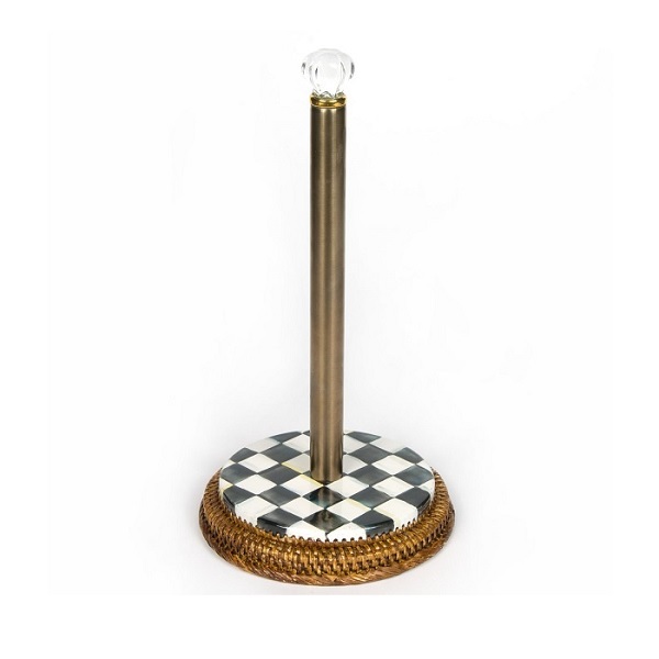 Держатель для бумажных полотенец расписан вручную фирменным стилем в виде чёрно-белой клетки, с центральным стержнем из нержавеющей стали, коронованным изящной стеклянной ручкой в виде распускающегося цветочного бутона.
