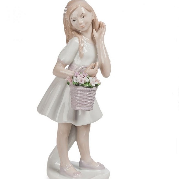 Шикарный подарок для сестры, подруги или мамы – статуэтка Девочка-кокетка. Изготовлена фигурка из фарфора. Белый цвет приятен взгляду и вызывает только светлые мысли и положительные эмоции. Букет в корзине, выполненный в розовых оттенках, напомнит о весне и цветении, о пробуждении всего живого. Чувственность, лёгкость и кокетство воплотились в статуэтке.
