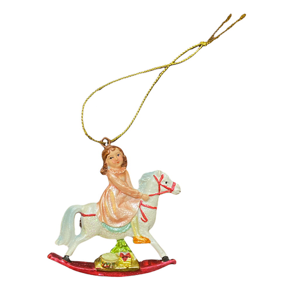Взгляните на эту ёлочную игрушку: милая девочка Лили играет в отважную наездницу, оседлав свою любимую лошадь-качалку. Белый конь с ухоженной гривой и длинным хвостом готов унести свою подругу в чудесные края и показать ей волшебные страны.