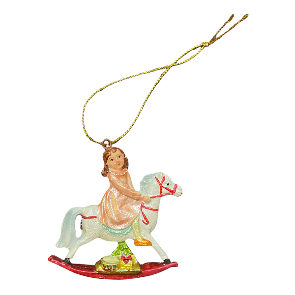Взгляните на эту ёлочную игрушку: милая девочка Лили играет в отважную наездницу, оседлав свою любимую лошадь-качалку. Белый конь с ухоженной гривой и длинным хвостом готов унести свою подругу в чудесные края и показать ей волшебные страны.