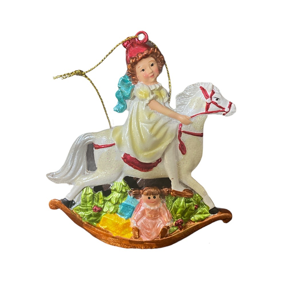 Взгляните на эту ёлочную игрушку: милая девочка Лили играет в отважную наездницу, оседлав свою любимую лошадь-качалку и совершенно позабыв про другие гостинцы, которые лежат возле нее. Белый конь с ухоженной гривой и длинным хвостом готов унести свою подругу в чудесные края и показать ей волшебные страны.