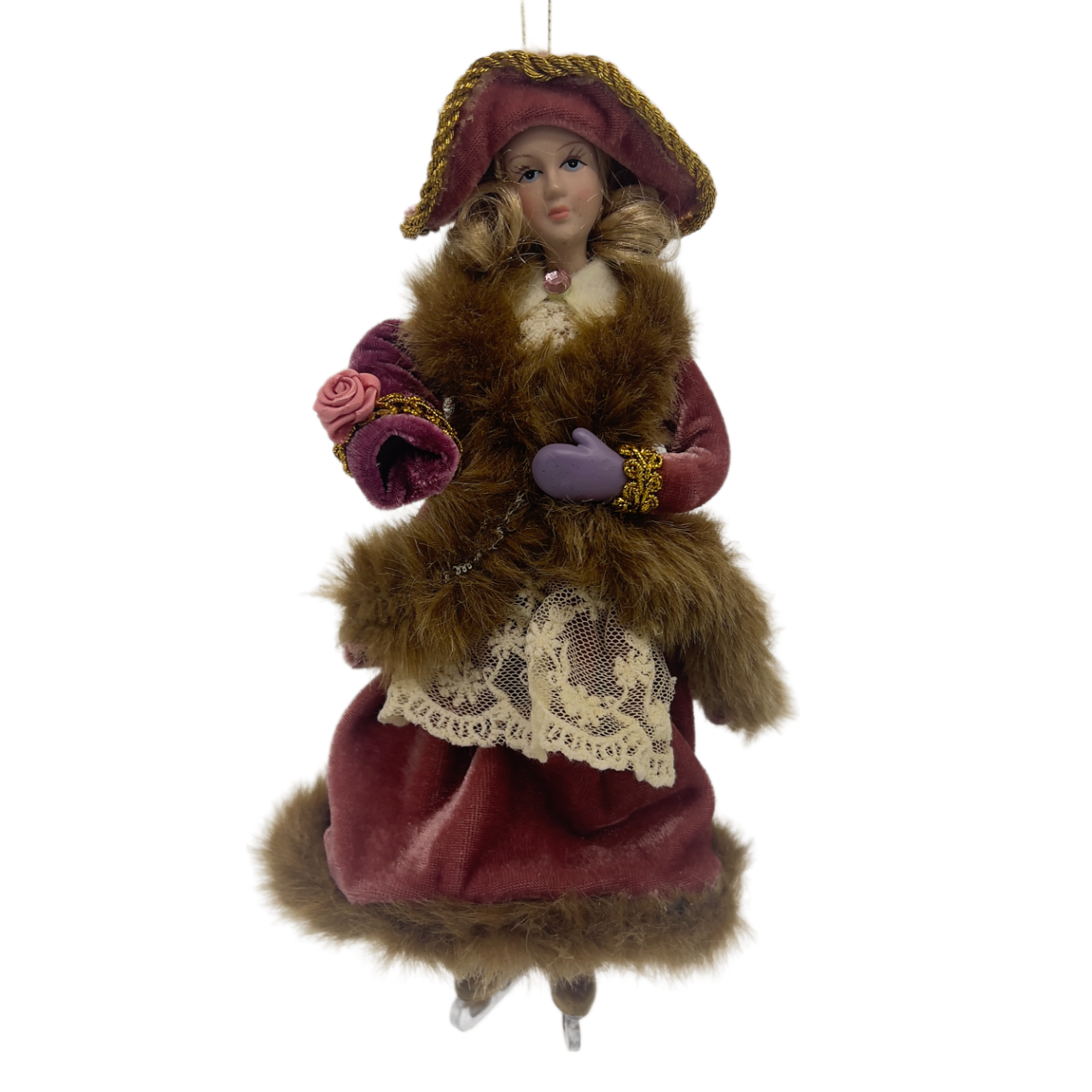 Яркая игрушка в виде куклы, катающейся на коньках, станет заметным украшением на любой ёлке и в любом новогоднем интерьере. Кукла одета в зимнюю шубку, отороченную мехом, и сшитую из парчовой ткани. Под ней на кукле надеты штаны и пышная юбка.