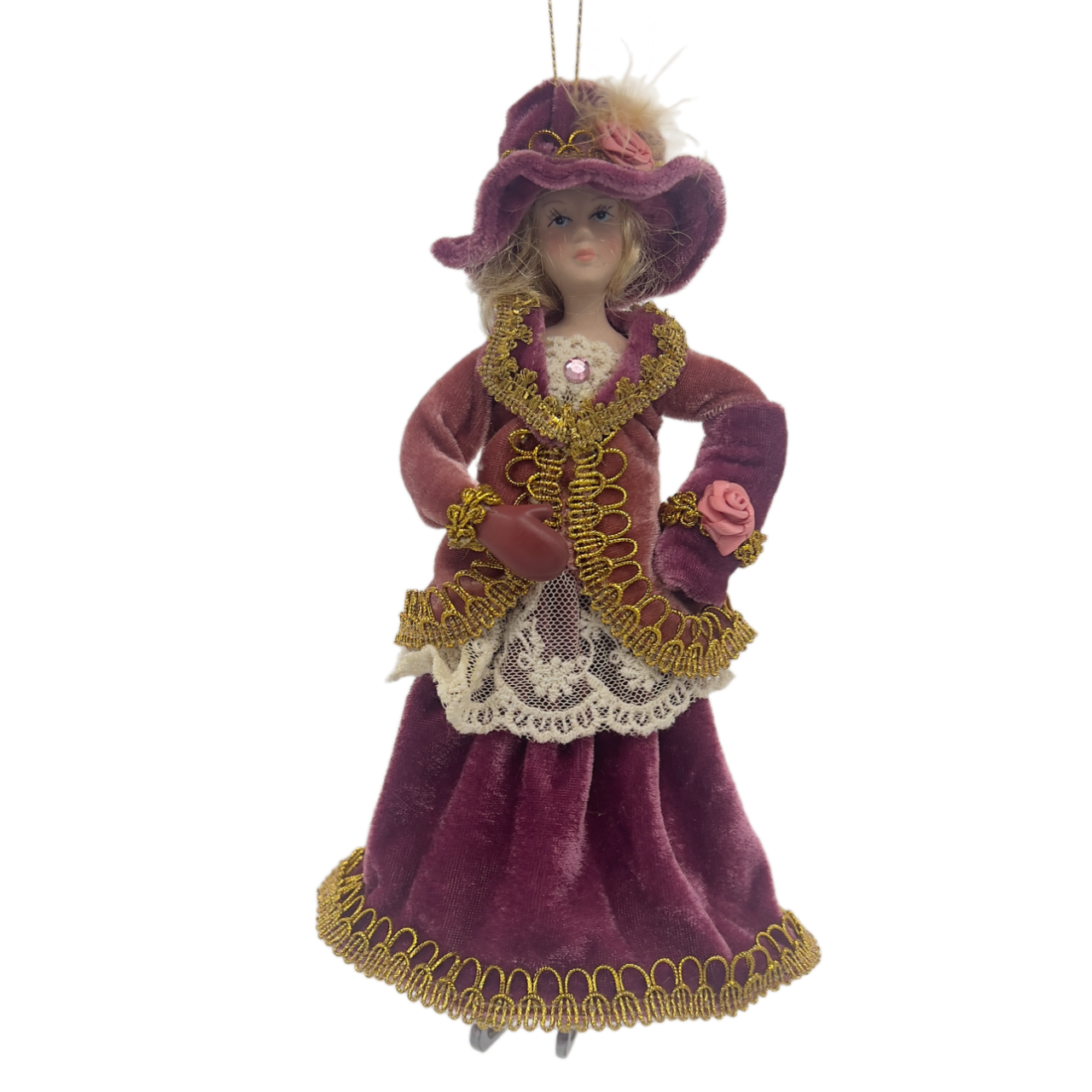 Яркая игрушка в виде куклы, катающейся на коньках, станет заметным украшением на любой ёлке и в любом новогоднем интерьере. Кукла одета в зимнюю шубку, отороченную мехом, и сшитую из парчовой ткани. Под ней на кукле надеты штаны и пышная юбка.