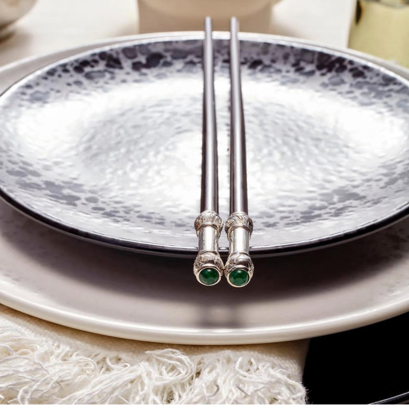 Вы любите японскую кухню и восточные традиции? Вас восхитят палочки для еды L`objet. Изящные приборы из тёмного отполированного дерева богато украшают стол. Наконечники из сияющего металла с резными узорами и нефритовыми кабошонами радуют глаз. Палочки удобно лежат в руке и дарят комфорт во время трапезы. Их утончённый стиль дополняет сервировку. Набор из четырёх штук.
