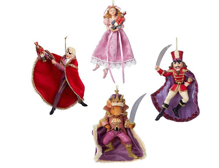 Персонажи из самой знаменитой новогодней сказки будут танцевать на вашей ёлке, привлекая расчудесные чудеса! Ассортимент включает в себя Клару в розовом платье, Дроссельмейера в красной накидке, Щелкунчика-принца в красном костюме с мечом и Мышиного короля в фиолетовой накидке с мечом.
