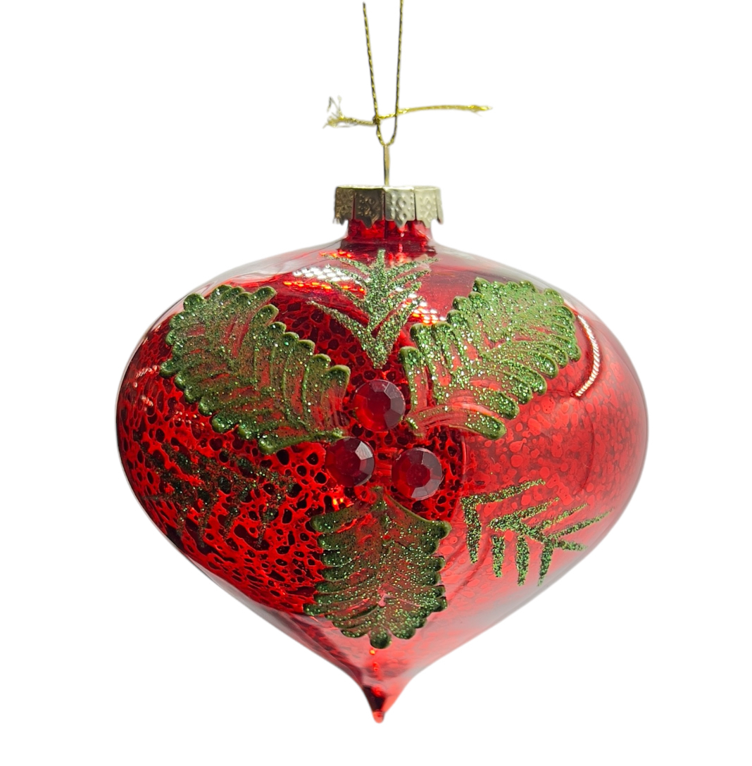 Праздничные игрушки выполнены из стекла и окрашены в красный цвет. Декор в виде контрастных листьев зелёного цвета интересно дополняет внешний вид роскошной игрушки.