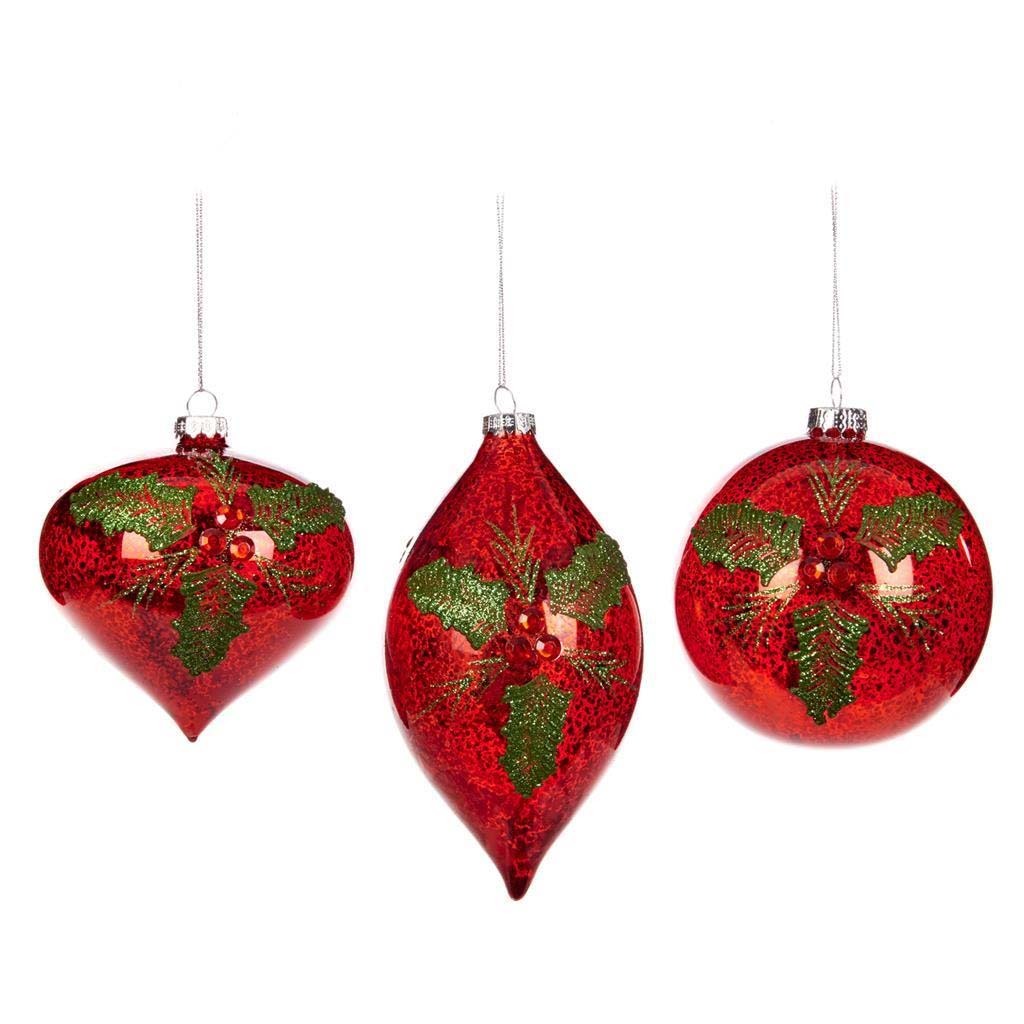 Праздничные игрушки выполнены из стекла и окрашены в красный цвет. Декор в виде контрастных листьев зелёного цвета интересно дополняет внешний вид роскошной игрушки.