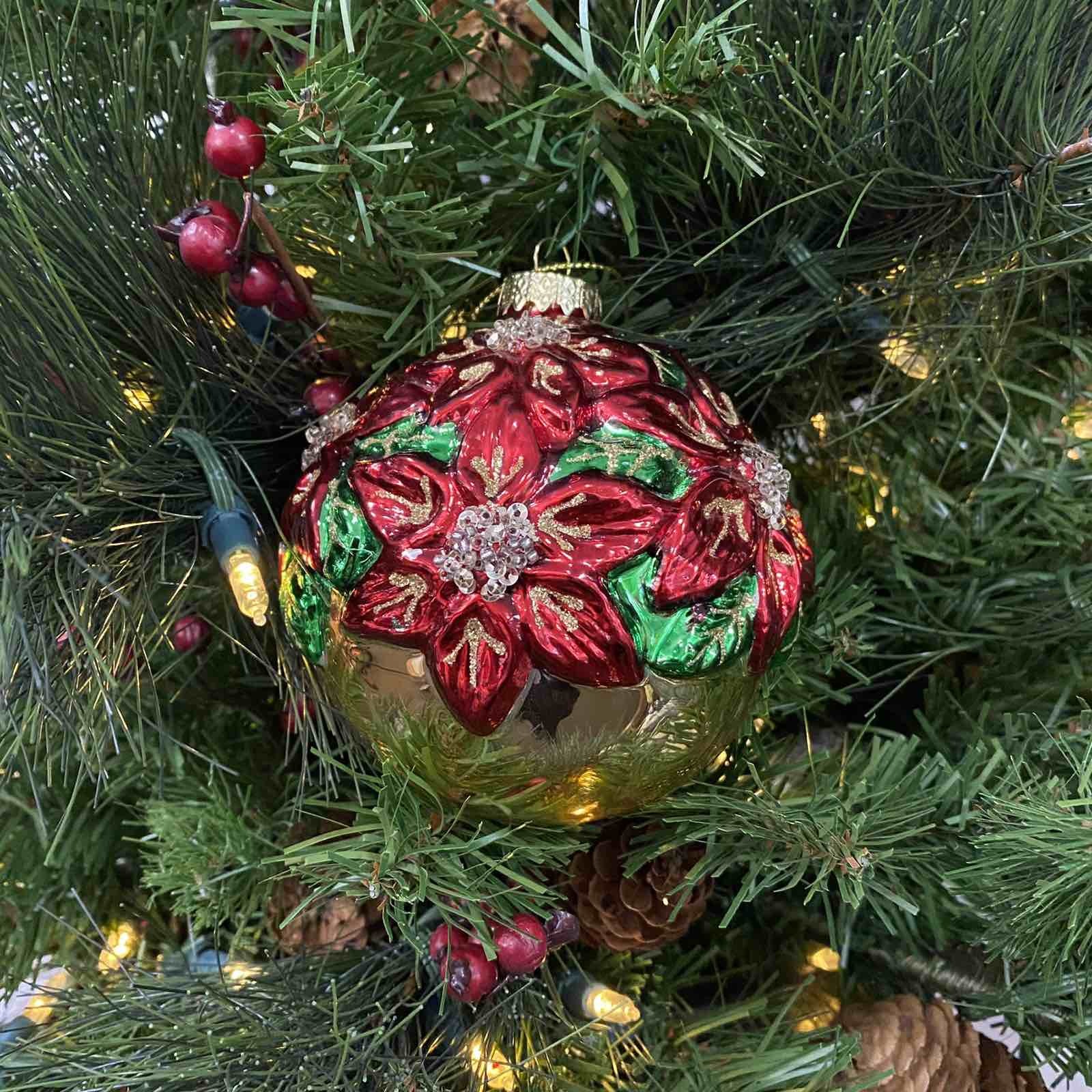 Роскошный ёлочный шар с красными цветами пуансеттии станет оригинальным украшением Вашей новогодней красавицы.