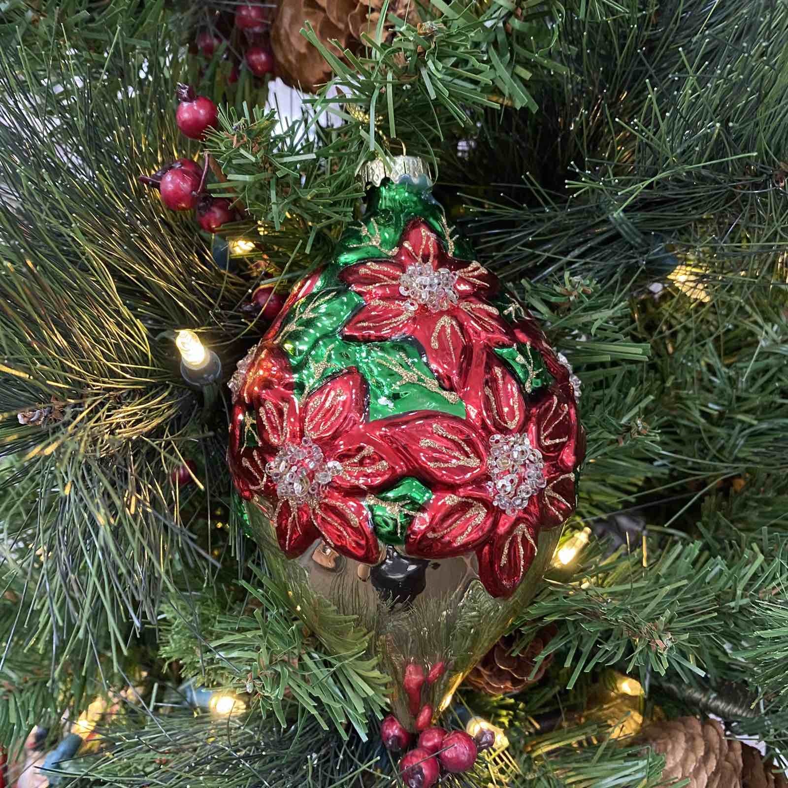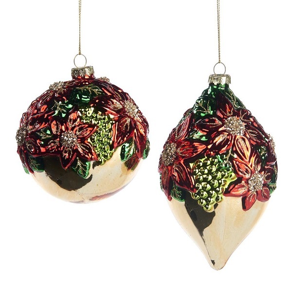 Роскошный ёлочный шар с красными цветами пуансеттии станет оригинальным украшением Вашей новогодней красавицы.