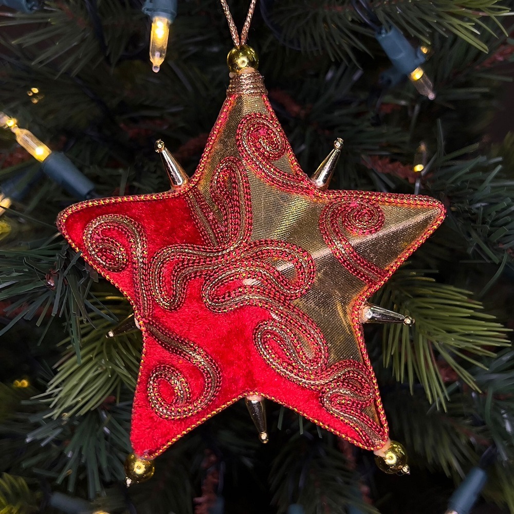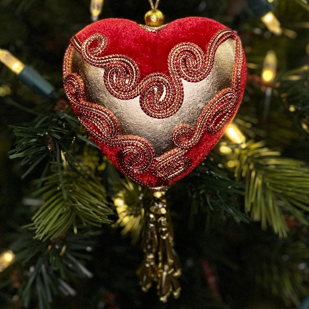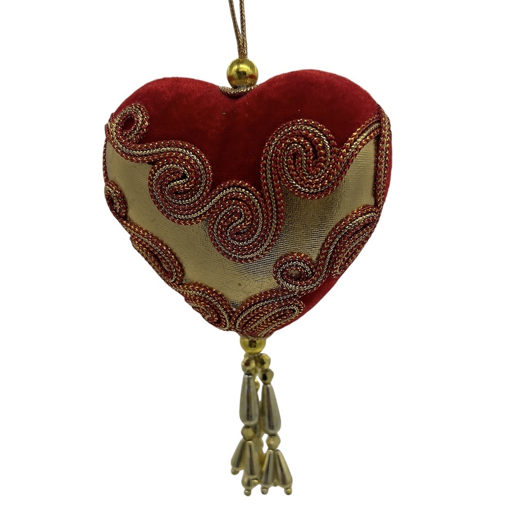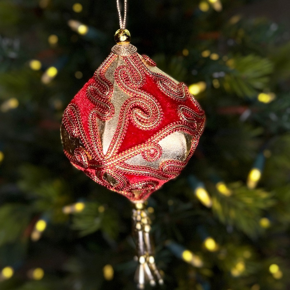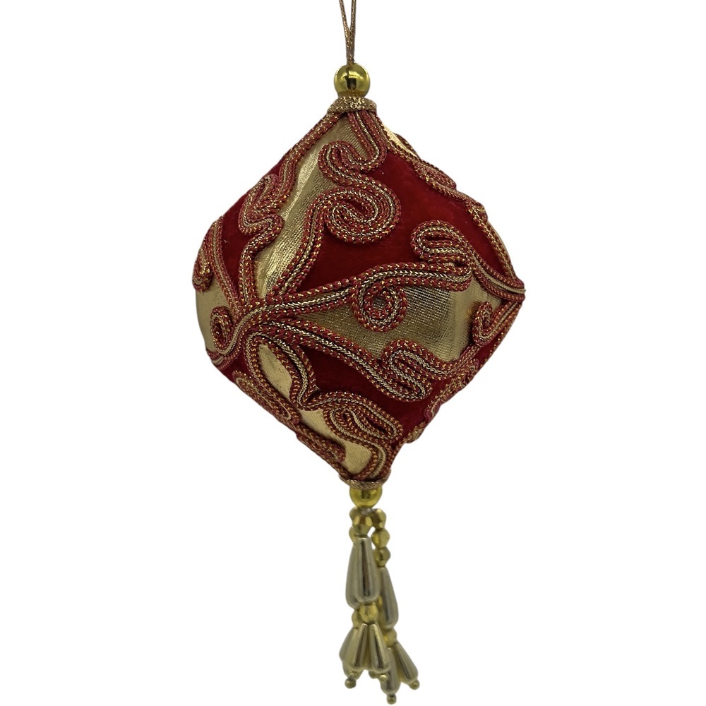 Красные шары разной формы украшены золотистым узором и орнаментом.