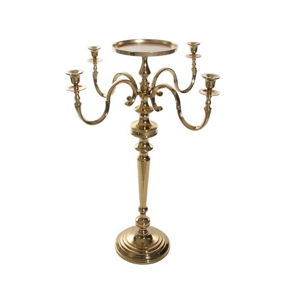 Классический канделябр на 5 свечей из качественного сплава , теплого золотого оттенка. Оригинальная форма канделябра и тонкие рожки, поддерживающие подсвечники - бутоны, сделаны вручную. Такой канделябр сможет украсить ваш интерьер и без свечи, а гладкая, глянцевая поверхность легко очищается и не ржавеет.
