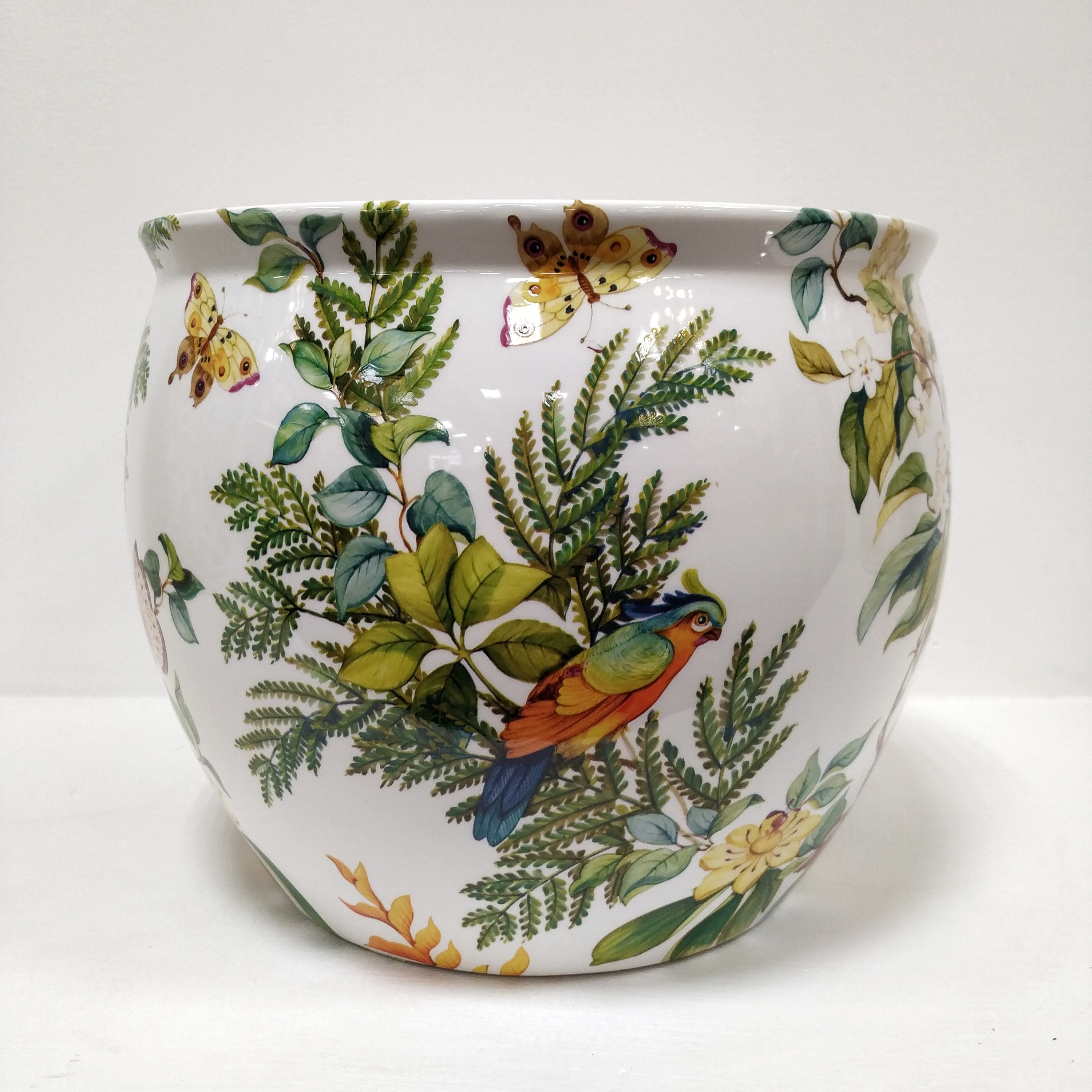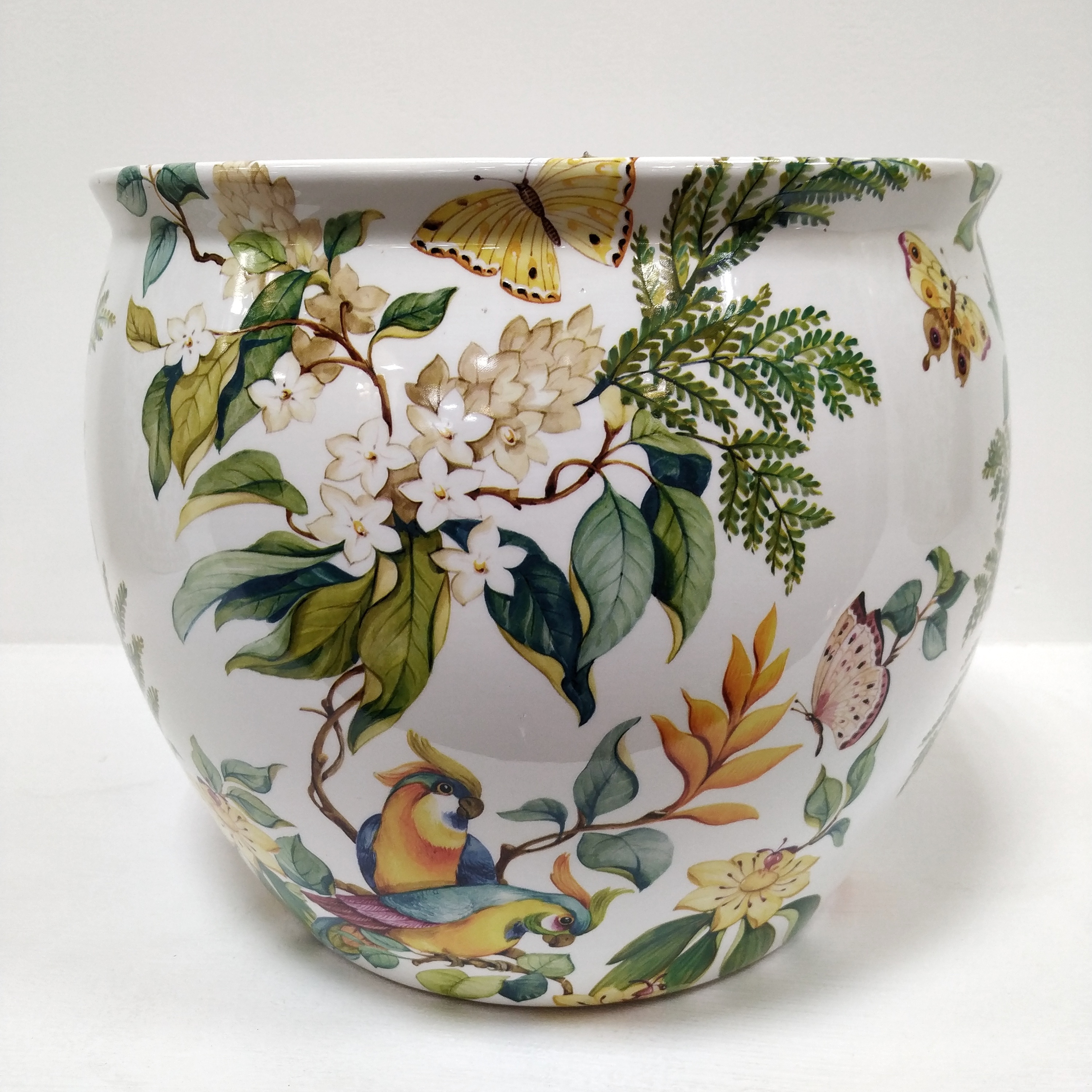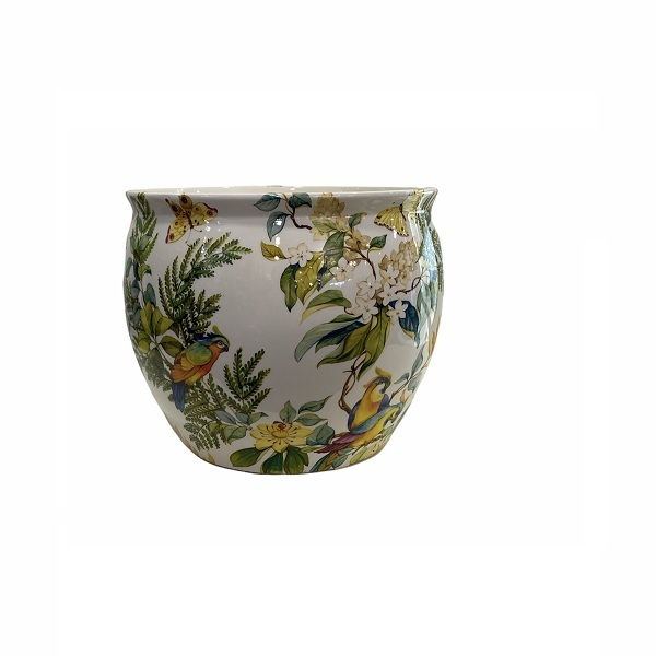 Кашпо круглое снаружи украшено экзотическими птицами среди цветущих кустарников. Идеально подходит в качестве аксессуара для интерьера, как классического, так и современного.