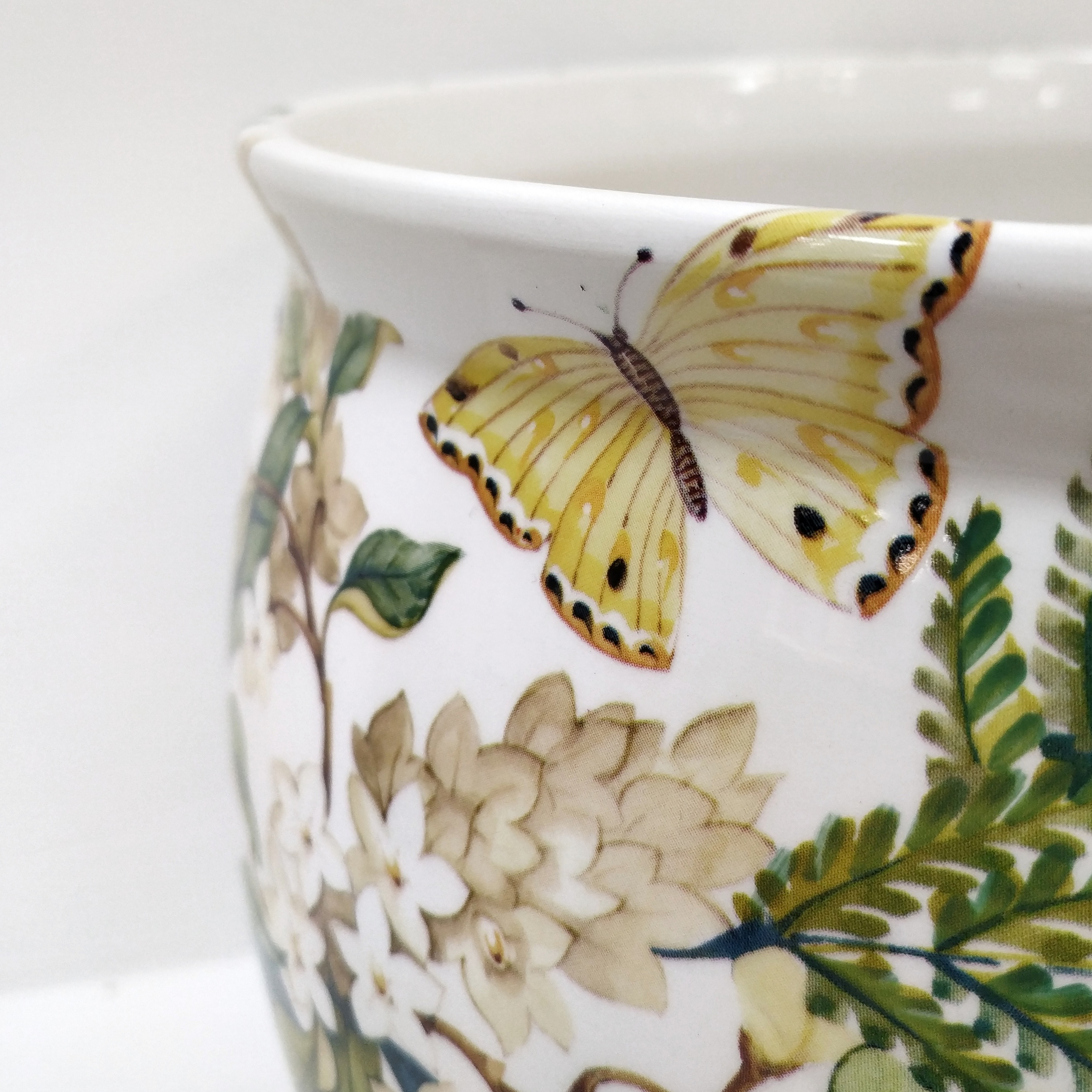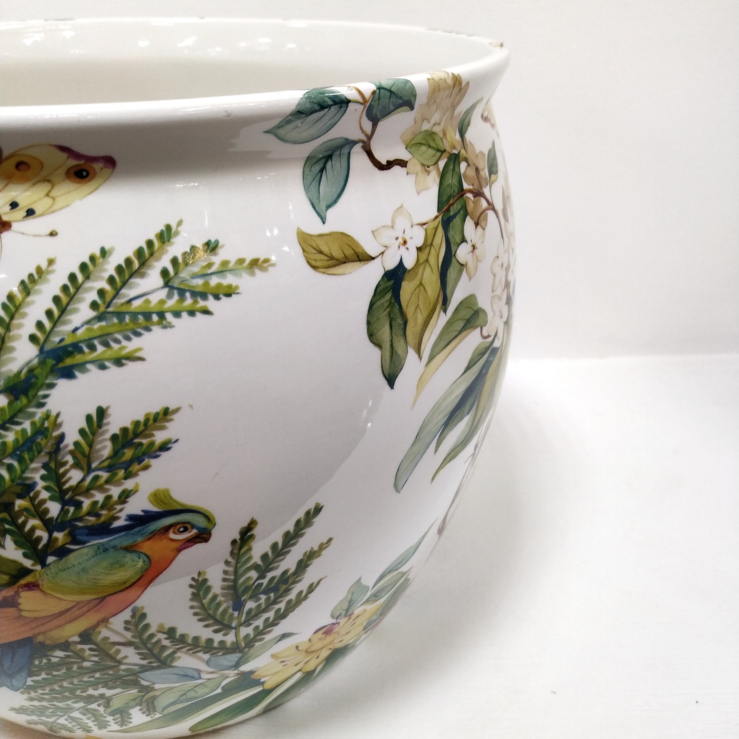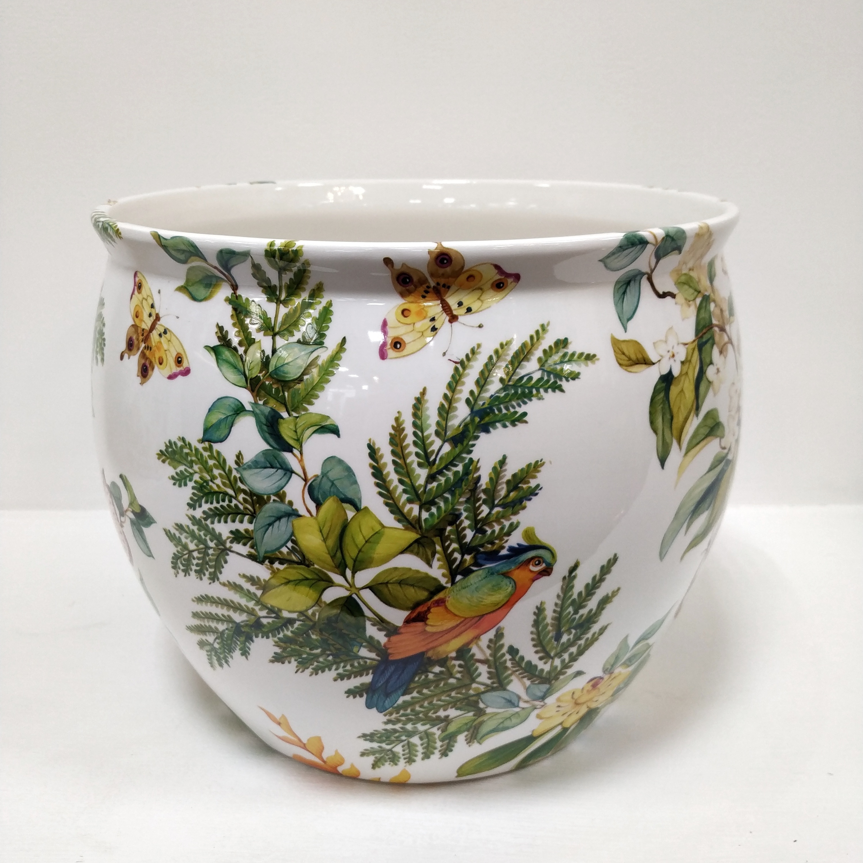 Кашпо круглое снаружи украшено экзотическими птицами среди цветущих кустарников. Идеально подходит в качестве аксессуара для интерьера, как классического, так и современного.