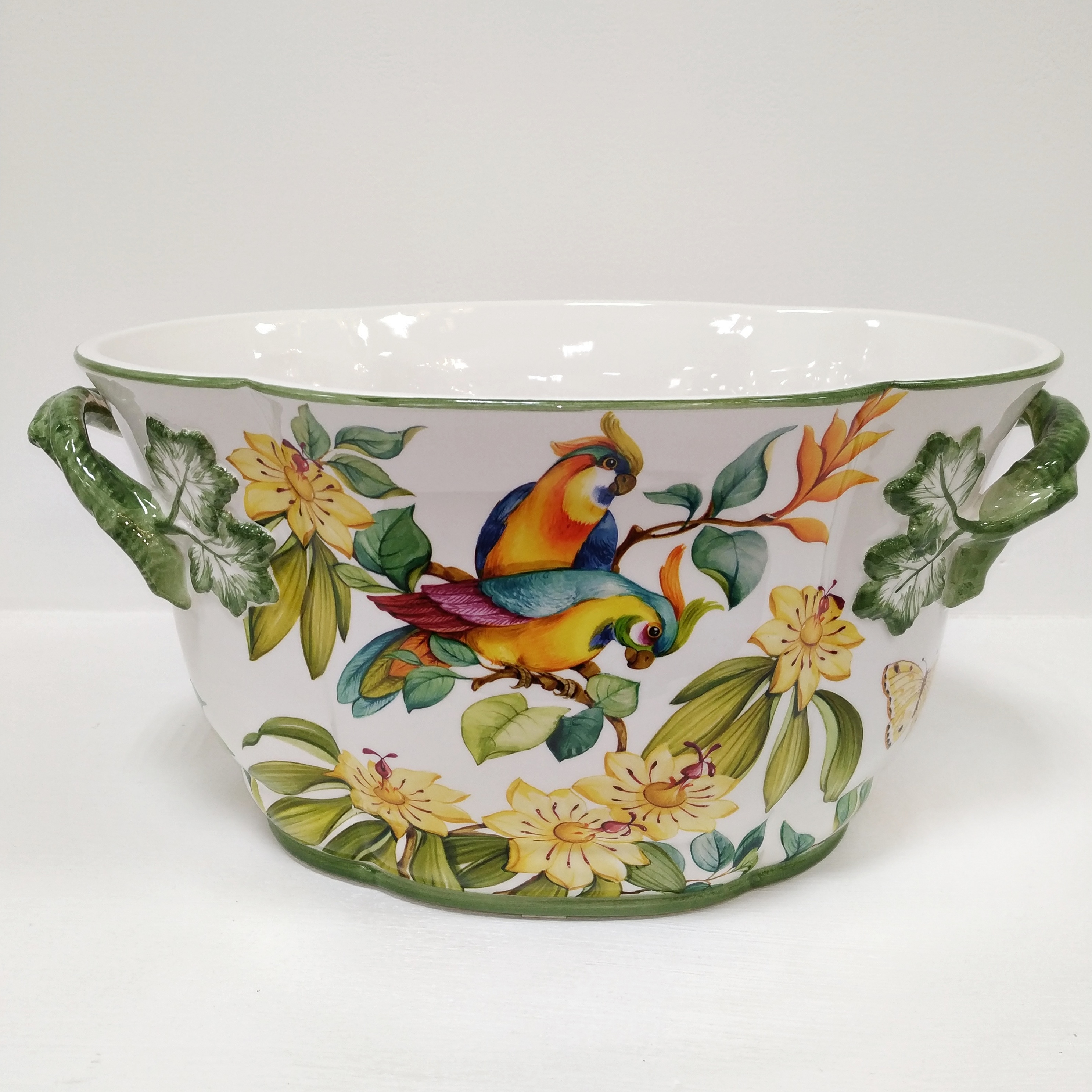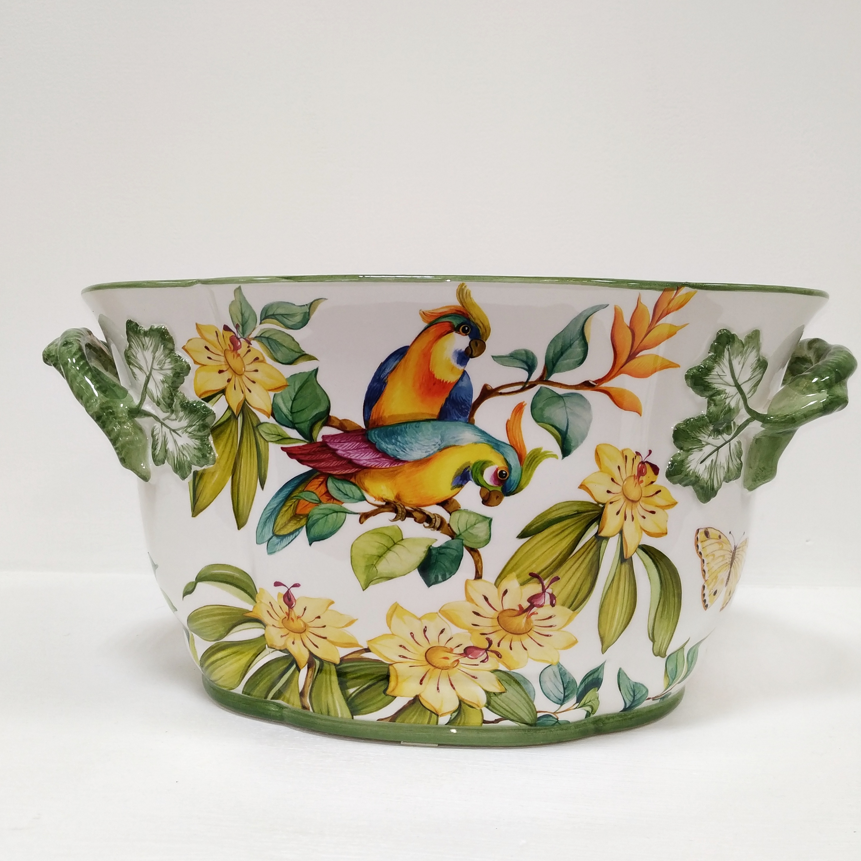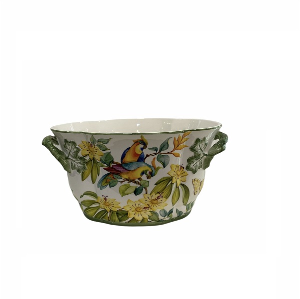 Овальное керамическое кашпо украшено экзотическими птицами среди цветущих кустарников. Это стильные и современные кашпо для декора квартиры и загородного дома. Подойдёт как в классический интерьер, так и в современный.
