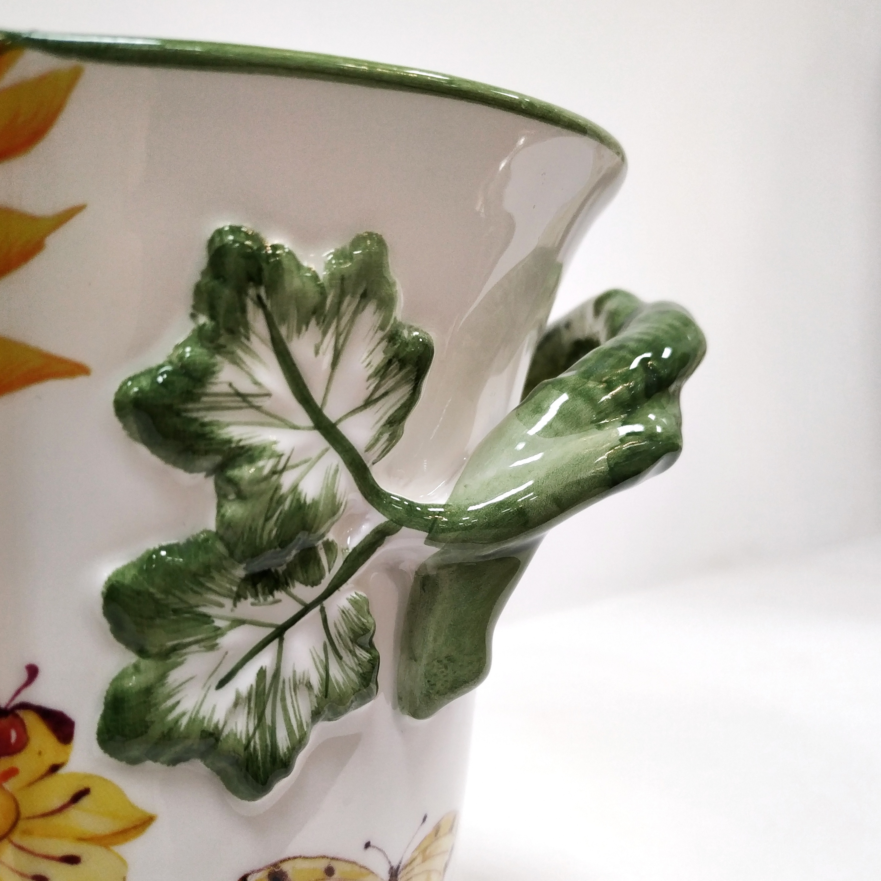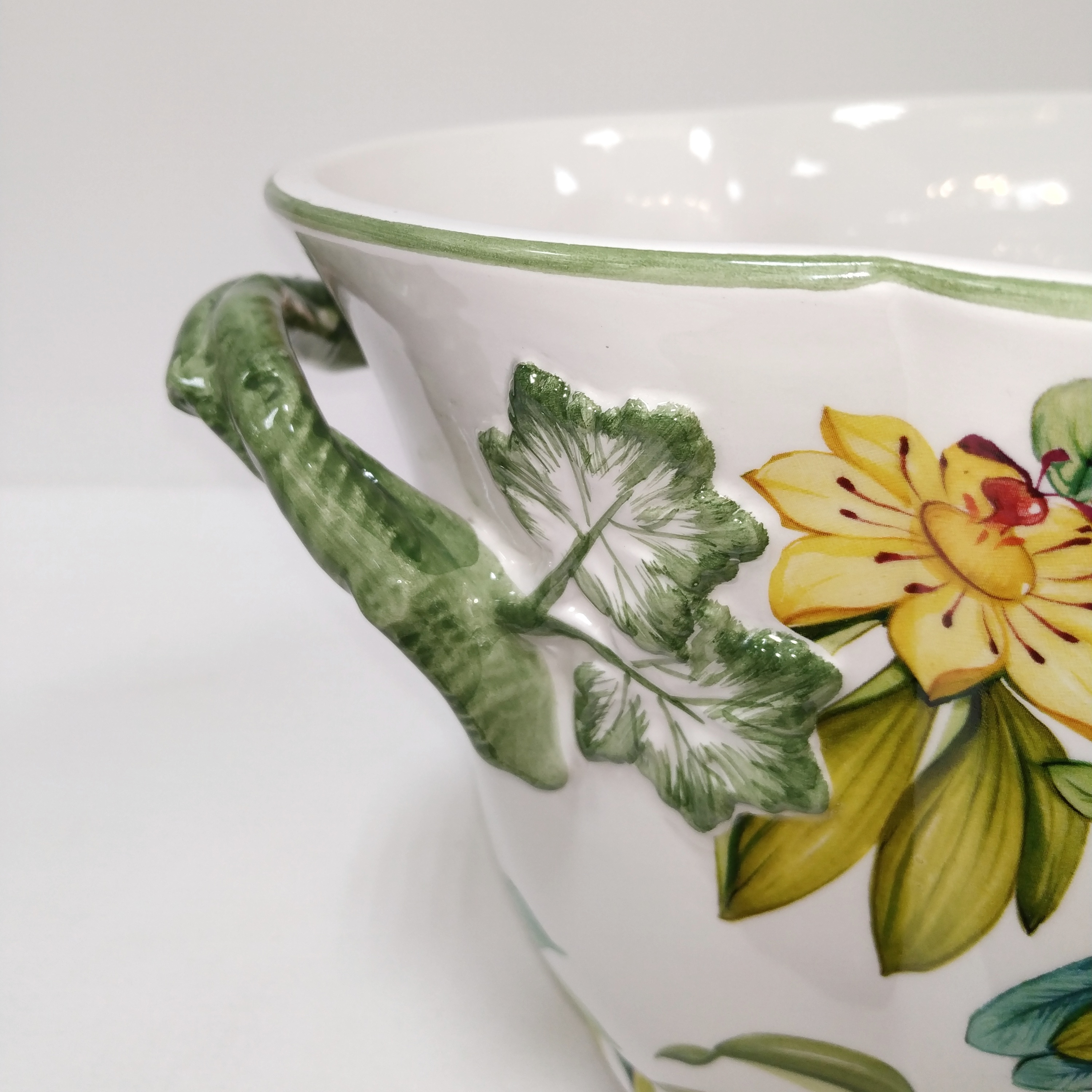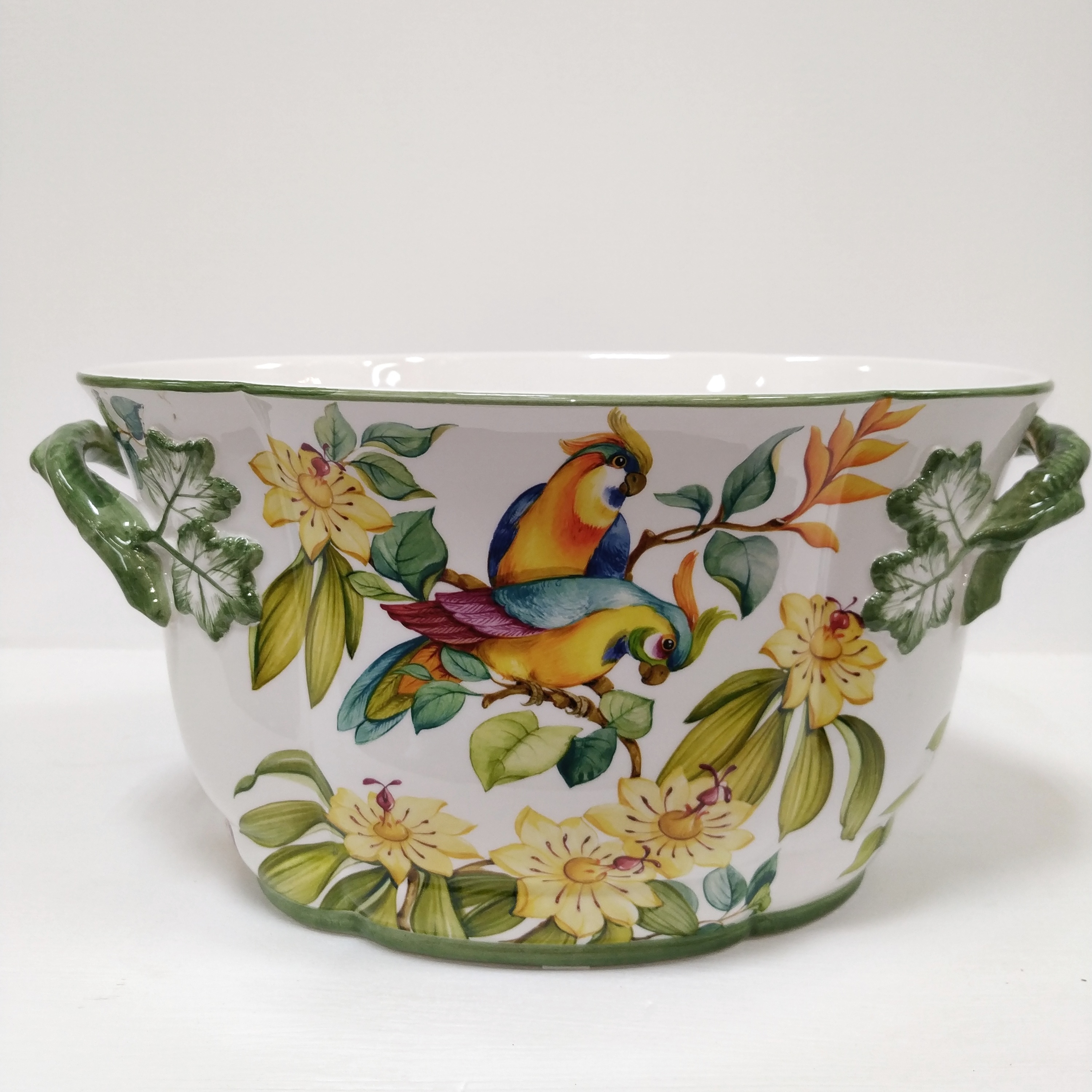Овальное керамическое кашпо украшено экзотическими птицами среди цветущих кустарников. Это стильные и современные кашпо для декора квартиры и загородного дома. Подойдёт как в классический интерьер, так и в современный.