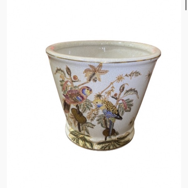 Кашпо для цветов в интерьере могут не только создать необычную, уютную атмосферу в помещении, но и сделать акцент на модном дизайне. Яркое, стильное кашпо декорировано растительным узором с попугаями.