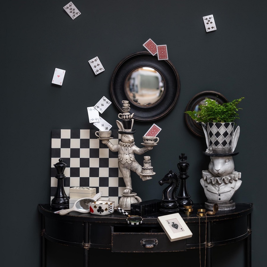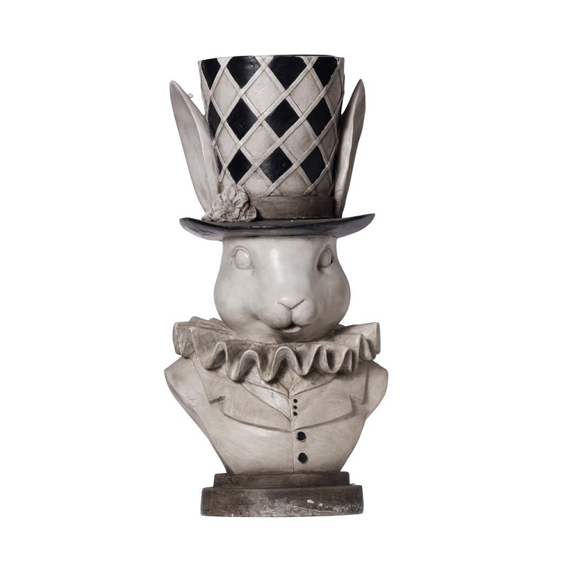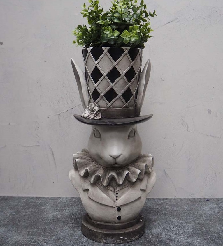 Кашпо в виде скульптуры кролика, одетого в костюм. Он носит высокий цилиндр с ромбовидным черно-белым узором. На шее у него - гофрированный воротник, а на теле - пиджак с пуговицами.