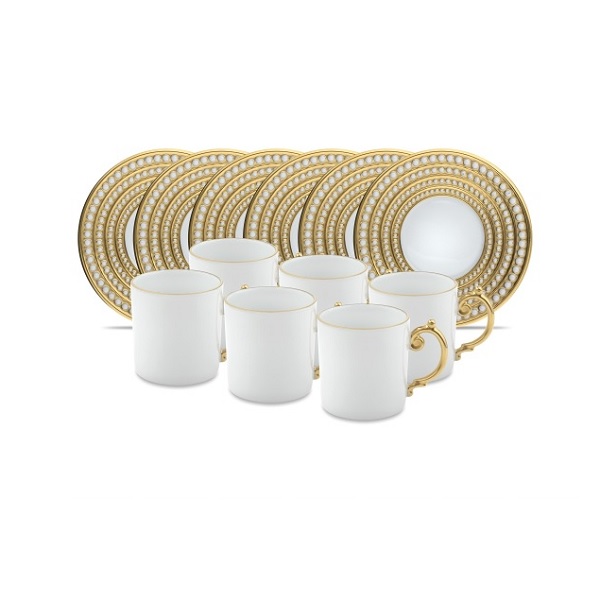 Кофейный набор на 6 персон из фарфора, из шести кофейных чашек с блюдцами, объём: 90 мл. 12 предметов. Коллекция Perlée появилась под впечатлением от непреходящей современности и бесконечной элегантности натурального жемчуга. Эта уникальная коллекция является воплощением классической столовой посуды. Изготовлена из Лиможского фарфора со скрупулёзно вручную расписанными золотом деталями, чтобы выделить отдельные жемчужины. В фирменной подарочной коробке.