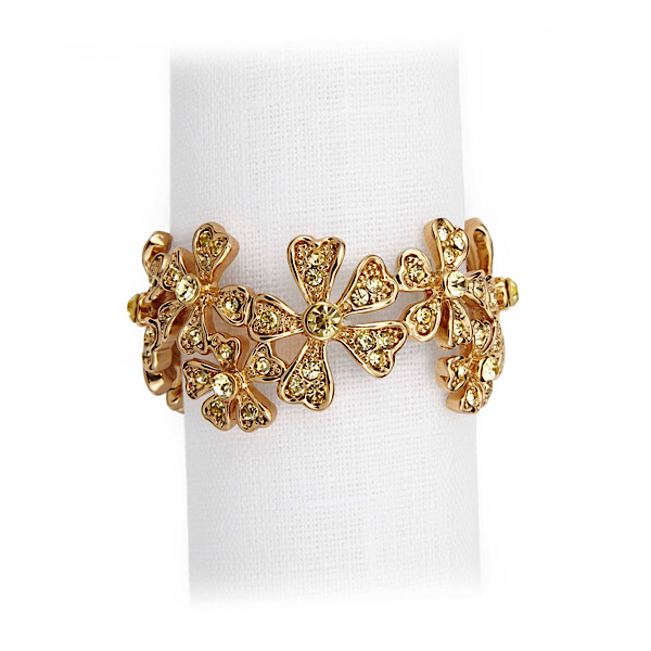 Хотите украсить праздничный стол, но не знаете, с чего начать? С колец для салфеток! Ведь именно салфетку первой берут в руки, а значит, обращают внимание на то, как она сложена, и на красоту держащего её кольца. Набор из четырех колец серии Garland от L'objet просто поражает своей красотой. Изящные предметы, выполненные в виде цветков с пятью лепестками покрыты золотом и декорированы кристаллами в огранке Swarovski.