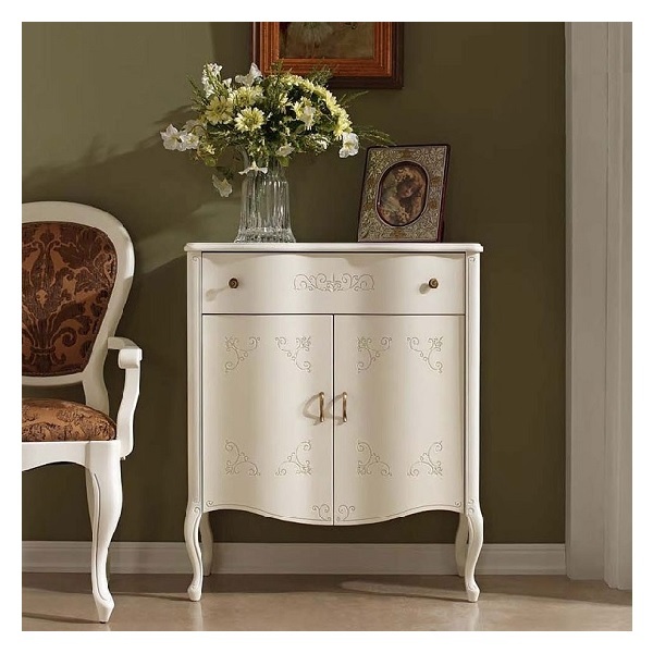 Комод будет прекрасно смотреться в прихожей, гостиной, интерьер которых выдержан в классическом стиле. Данная модель имеет три полки, закрытые двумя дверцами в форме волны, над которыми находится выдвижной ящик для мелочей. Натуральная древесная текстура, орнамент на фасадной части и изящная фурнитура украшают поверхность комода. Опорой изделия служат слегка изогнутые ножки с резьбой. Качественные экологичные материалы и фурнитура обеспечивают надежность и долговечность конструкции.