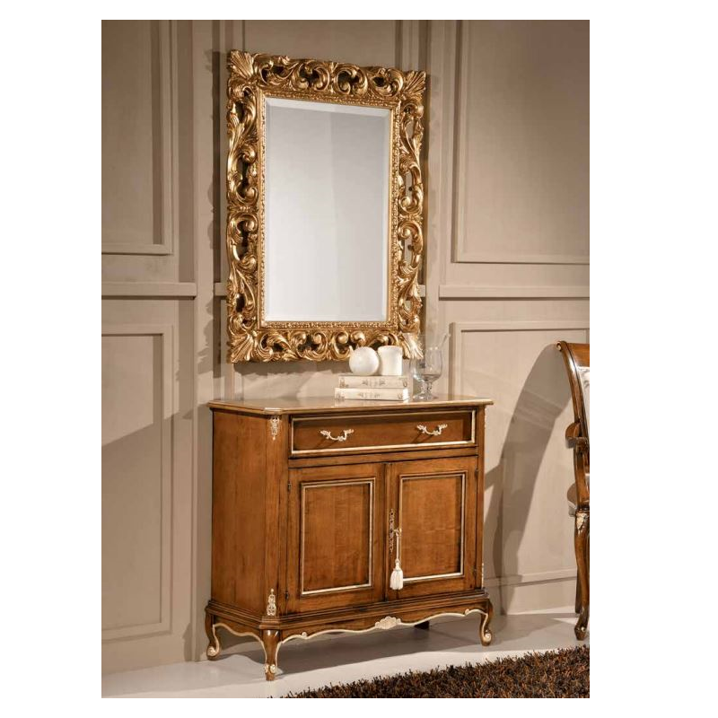 Комод выглядит, как настоящая драгоценность. Его поверхности украшены сусальным золотом. Его поддерживают крепкие ножки. Их высота обеспечивает доступ к пространству под комодом, что облегчает уборку в помещении.