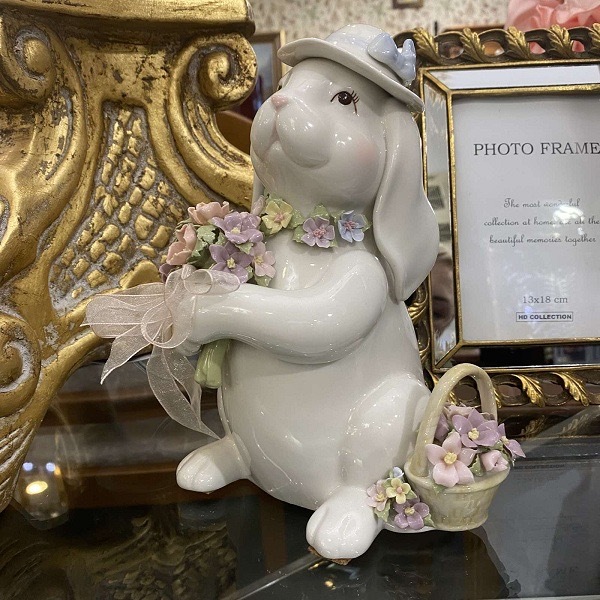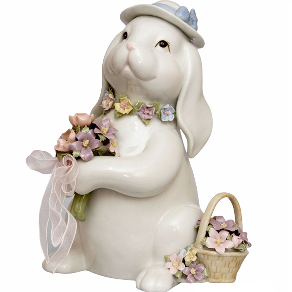 Симпатичный беленький кролик принёс Вам цветы. Много цветов – в руках целая охапка, возле ног – заполненная цветами корзинка и на шее целое цветочное ожерелье. На голове – шляпа с голубенькой ленточкой – единственное украшение цветочного кролика. Он выступает в роли посланника: если Вы не решаетесь лично преподнести своей возлюбленной букет цветов, подарите такого кролика, а цветы уже он вручит. Да ещё и музыку соответствующую исполнит: это ведь не просто скульптурная композиция, а музыкальная фигурка. И будет этот кролик напоминать о Вас долгое время. Вы уже и сами осмелеете и подарите букет, и в любви признаетесь, а кролик будет по-прежнему протягивать свой букетик и играть всё ту же мелодию…