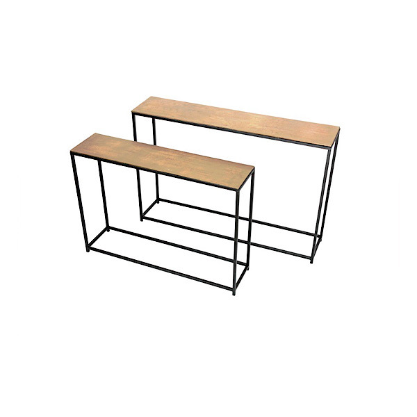 Консоль изготовлена из латунированного алюминия с античной отделкой. Рамка из чёрного матового чугуна выглядит традиционной и вневременной. Удлинённые пропорции металлического стола идеально подходят для создания композий из фотографий в рамке, цветов и предметов искусства.