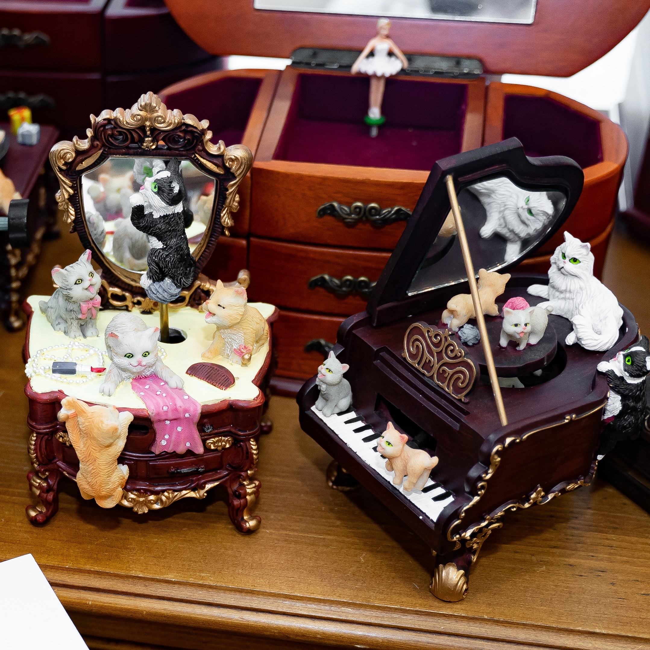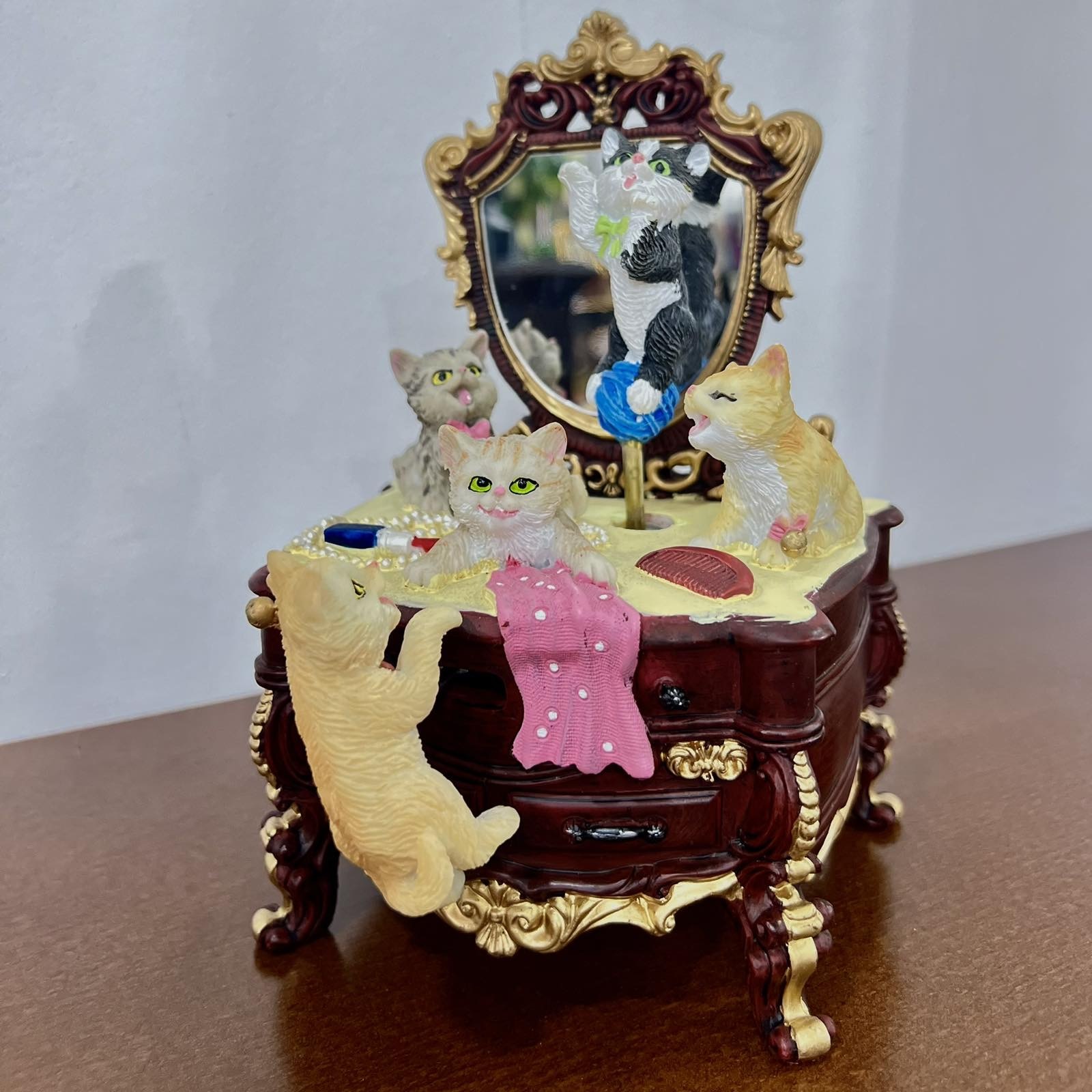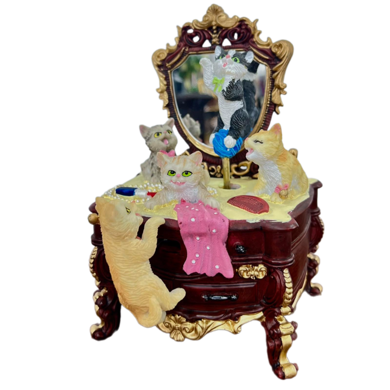 Очень милые котики на комоде с зеркалом понравятся взрослым и детишкам. Симпатичные пушистые мордашки мило улыбаются и дарят отличное настроение. Такая музыкальная шкатулка может стать красивым презентом близкому человеку или же отличным сувениром.