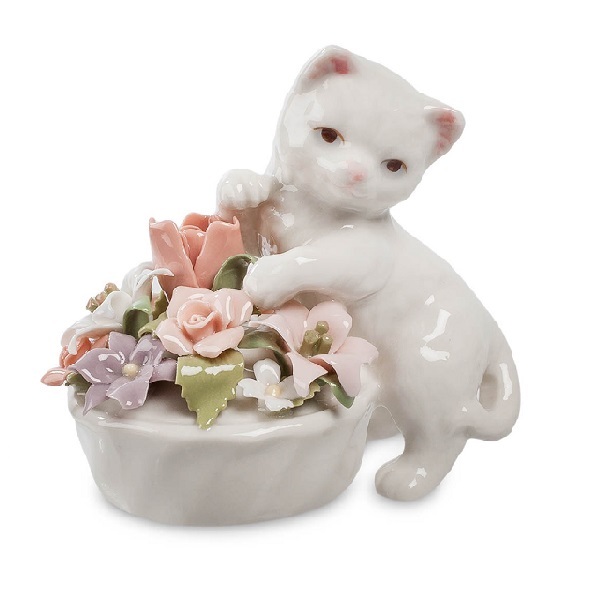 Целая корзина цветов! Пусть очень маленькая, пусть выполненная из фарфора, но зато какая яркая и красивая! Такие лепестки не завянут никогда, сохранив память о подарке надолго. И в придачу к цветочной композиции положен котенок. Маленький, беленький, симпатичный. Из простого любопытства сунул он носик в цветы – нет ли там какой-либо бабочки или кузнечика. Его позвали, он на зов оглянулся, но не ушел: некогда мне, я кузнечика ищу. Если та, которой вы собрались вручить этот маленький сувенир, любит не только цветы, но и кошек, подарок явно достигнет своей цели: запомнится надолго!