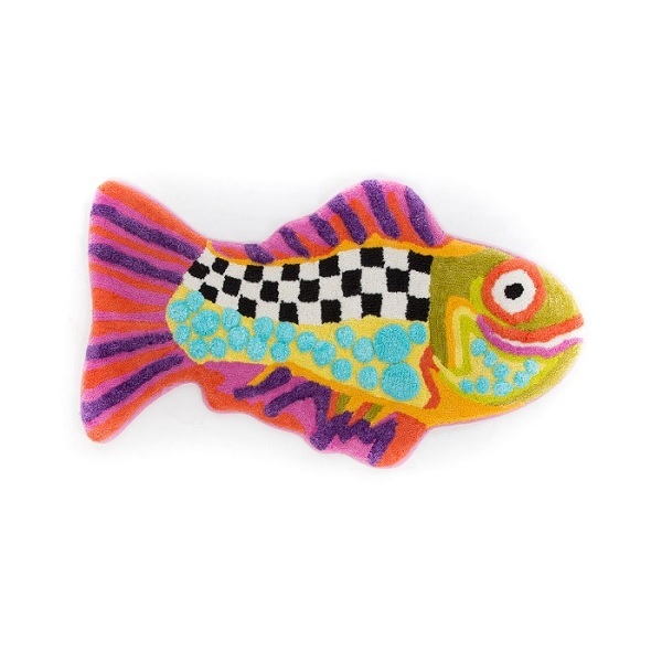 Коврик для ванной в виде маленькой счастливой рыбки украшен чёрно-белой клеткой, цветными полосками, точками, яркими неоновыми оттенками, широкой доброй усмешкой. Представлен в виде плюшевой композиции.