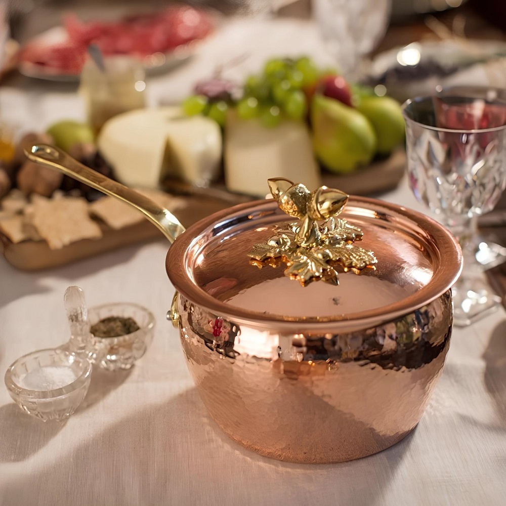 Ковш идеален для отваривания и тушения, для приготовления соусов, гарниров, рагу. Твёрдая медь позволяет теплу равномерно распределяться по дну и бокам ёмкости, а внутреннее покрытие из олова препятствует окислению продуктов. Пища, приготовленная в такой посуде, не теряет своих полезных свойств, не изменяет вкус и цвет, и в результате Вы получаете совершенное блюдо.